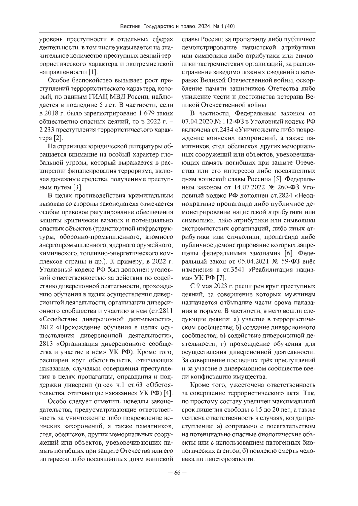 На страницах юридической литературы обращается внимание на особый характер глобальной угрозы, который выражается в расширении финансирования терроризма, включая денежные средства, полученные преступным путём [3]. В целях противодействия криминальным вызовам со стороны законодателя отмечается особое правовое регулирование обеспечения защиты критически важных и потенциально опасных объектов (транспортной инфраструктуры, оборонно-промышленного, атомного энергопромышленного, ядерного оружейного, химического, топливно-энергетического комплексов страны и др.). К примеру, в 2022 г. Уголовный кодекс РФ был дополнен уголовной ответственностью за действия по содействию диверсионной деятельности, прохождению обучения в целях осуществления диверсионной деятельности, организации диверсионного сообщества и участию в нём (ст.2811 «Содействие диверсионной деятельности», 2812 «Прохождение обучения в целях осуществления диверсионной деятельности», 2813 «Организация диверсионного сообщества и участие в нём» УК РФ). Кроме того, расширен круг обстоятельств, отягчающих наказание, случаями совершения преступления в целях пропаганды, оправдания и поддержки диверсии (п.«с» ч.1 ст.63 «Обстоятельства, отягчающие наказание» УК РФ) [4].