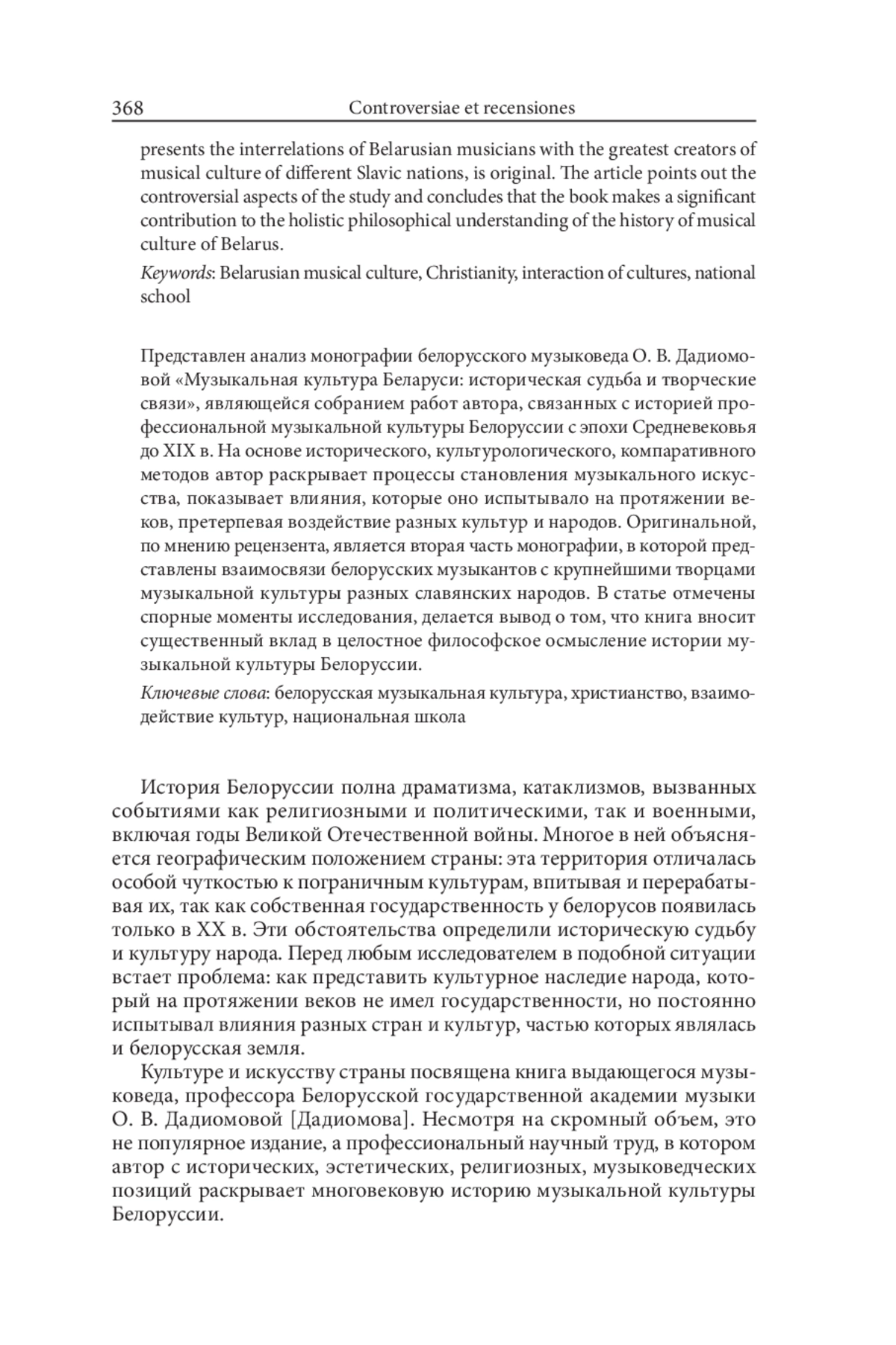 Рецензия на: Дадиомова О. В. Музыкальная культура Беларуси: историческая судьба и творческие связи. - 3-е изд., доп. - Минск: ИВЦ Минфина, 2020. - 176 с. Представлен анализ монографии белорусского музыковеда О. В. Дадиомовой «Музыкальная культура Беларуси: историческая судьба и творческие связи», являющейся собранием работ автора, связанных с историей профессиональной музыкальной культуры Белоруссии с эпохи Средневековья до XIX в. На основе исторического, культурологического, компаративного методов автор раскрывает процессы становления музыкального искусства, показывает влияния, которые оно испытывало на протяжении веков, претерпевая воздействие разных культур и народов. Оригинальной, по мнению рецензента, является вторая часть монографии, в которой представлены взаимосвязи белорусских музыкантов с крупнейшими творцами музыкальной культуры разных славянских народов. В статье отмечены спорные моменты исследования, делается вывод о том, что книга вносит существенный вклад в целостное философское осмысление истории музыкальной культуры Белоруссии.