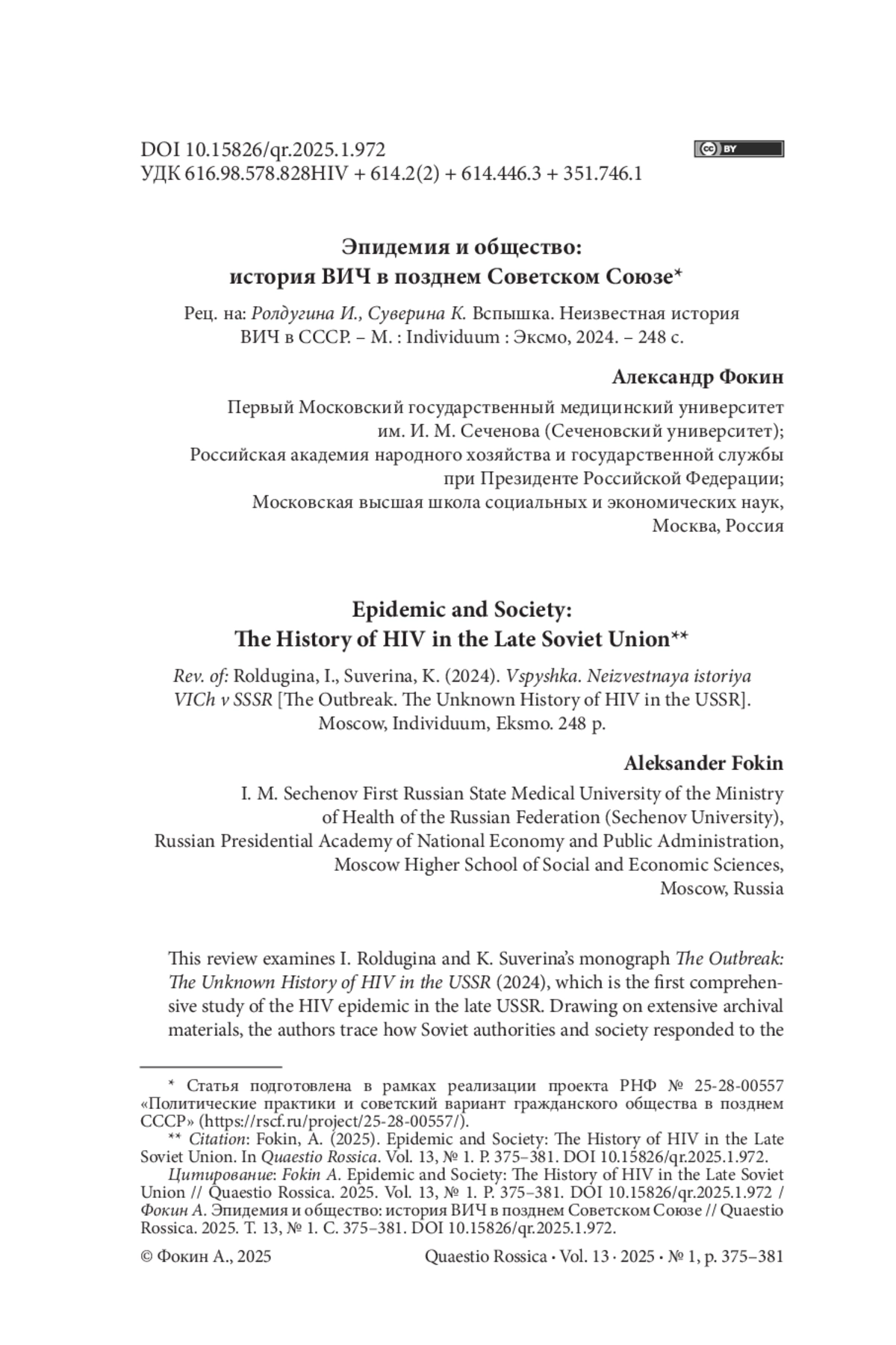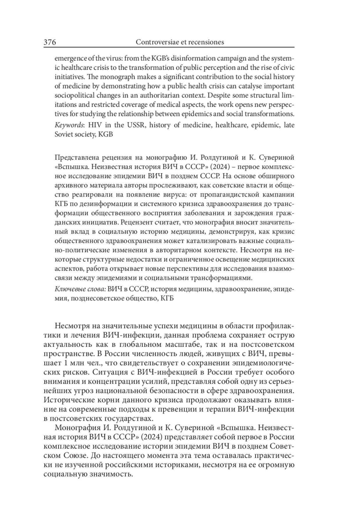 Рецензия на: Ролдугина И., Суверина К. Вспышка. Неизвестная история ВИЧ в СССР. - М.: Individuum: Эксмо, 2024. - 248 с. Представлена рецензия на монографию И. Ролдугиной и К. Сувериной «Вспышка. Неизвестная история ВИЧ в СССР» (2024) - первое комплексное исследование эпидемии ВИЧ в позднем СССР. На основе обширного архивного материала авторы прослеживают, как советские власти и общество реагировали на появление вируса: от пропагандистской кампании КГБ по дезинформации и системного кризиса здравоохранения до трансформации общественного восприятия заболевания и зарождения гражданских инициатив. Рецензент считает, что монография вносит значительный вклад в социальную историю медицины, демонстрируя, как кризис общественного здравоохранения может катализировать важные социально-политические изменения в авторитарном контексте. Несмотря на некоторые структурные недостатки и ограниченное освещение медицинских аспектов, работа открывает новые перспективы для исследования взаимосвязи между эпидемиями и социальными трансформациями.