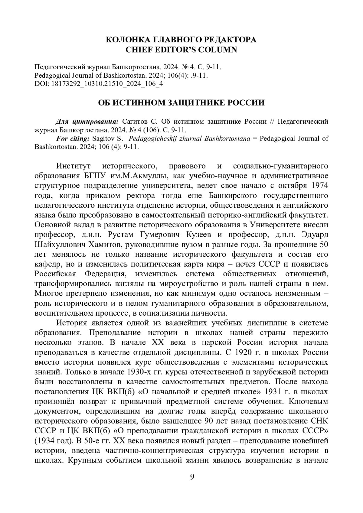 Институт исторического, правового и социально-гуманитарного образования БГПУ им. М. Акмуллы, как учебно-научное и административное структурное подразделение университета, ведет свое начало с октября 1974 года, когда приказом ректора тогда еще Башкирского государственного педагогического института отделение истории, обществоведения и английского языка было преобразовано в самостоятельный историко-английский факультет. Основной вклад в развитие исторического образования в Университете внесли профессор, д. и. н. Рустам Гумерович Кузеев и профессор, д. п. н. Эдуард Шайхуллович Хамитов, руководившие вузом в разные годы. За прошедшие 50 лет менялось не только название исторического факультета и состав его кафедр, но и изменилась политическая карта мира – исчез СССР и появилась Российская Федерация, изменилась система общественных отношений, трансформировались взгляды на мироустройство и роль нашей страны в нем. Многое претерпело изменения, но как минимум одно осталось неизменным – роль исторического и в целом гуманитарного образования в образовательном, воспитательном процессе, в социализации личности.