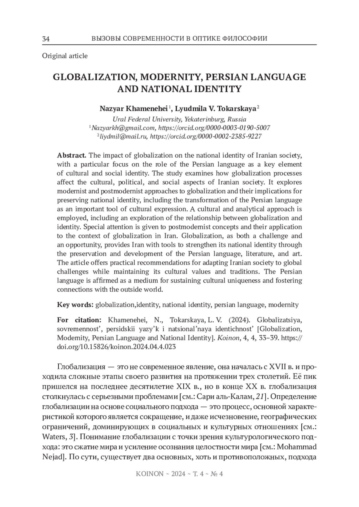 17. Mohammad Nejad Y. Globalization, Persian Language and Literature and National Identity // Challenges of the World. 2020. № 1 (4). Р. 91-115.