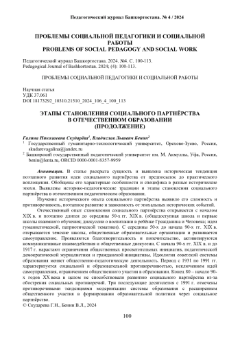 Отечественный опыт становления социального партнёрства открывается с началом XIX в. и поэтапно длится до середины 50-х гг. XIX в. (общедоступная школа и первые школы взаимного обучения; дискуссии о воспитании в ребёнке Гражданина и Человека; идеи гуманистической, патриотической тематики). С середины 50-х до начала 90-х гг. XIX в. открываются земские школы, общественные образовательные организации и развивается самоуправление. Проявляются благотворительность и попечительство, активизируются коммуникативные взаимодействия и общественные дискуссии. С начала 90-х гг. XIX в. и до 1917 г. нарастают ограничения общественных просветительных инициатив, педагогической демократической журналистики и гражданской инициативы. Идеология советской системы образования меняет общественно-педагогическую деятельность. Период с 1931 по 1991 гг. характеризуется социальной и образовательной противоречивостью, исключением идей самоуправления, ограничением общественного участия в образовании. Конец 80 ‒ начало 90- х годов ХХ века в целом не способствовали развитию социального партнёрства из-за обострения социальных противоречий. Три последующие десятилетия с 1991 г. отмечены противоречивыми тенденциями модернизации системы образования с расширением общественного участия в формировании образовательной политики через социальное партнёрство.