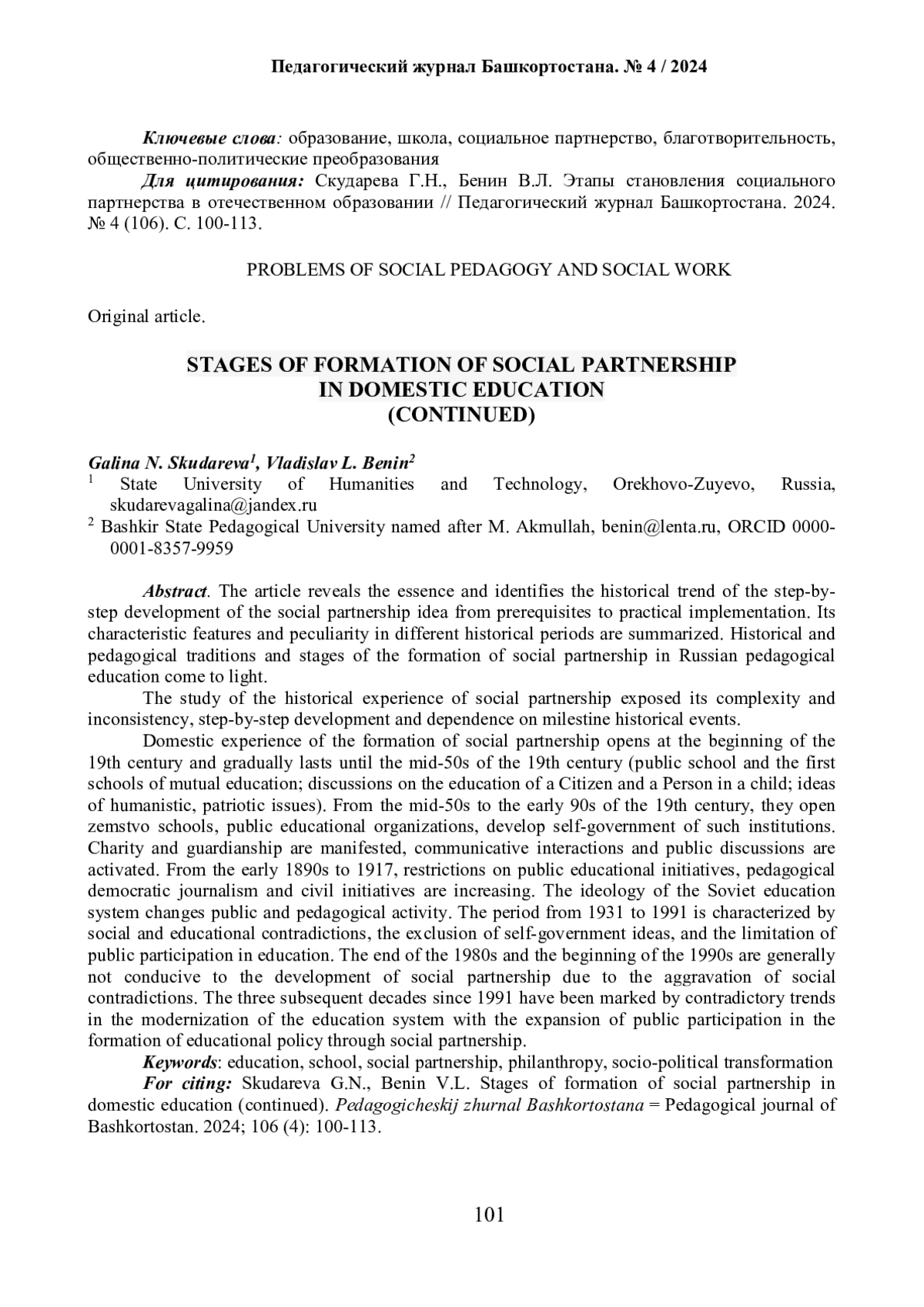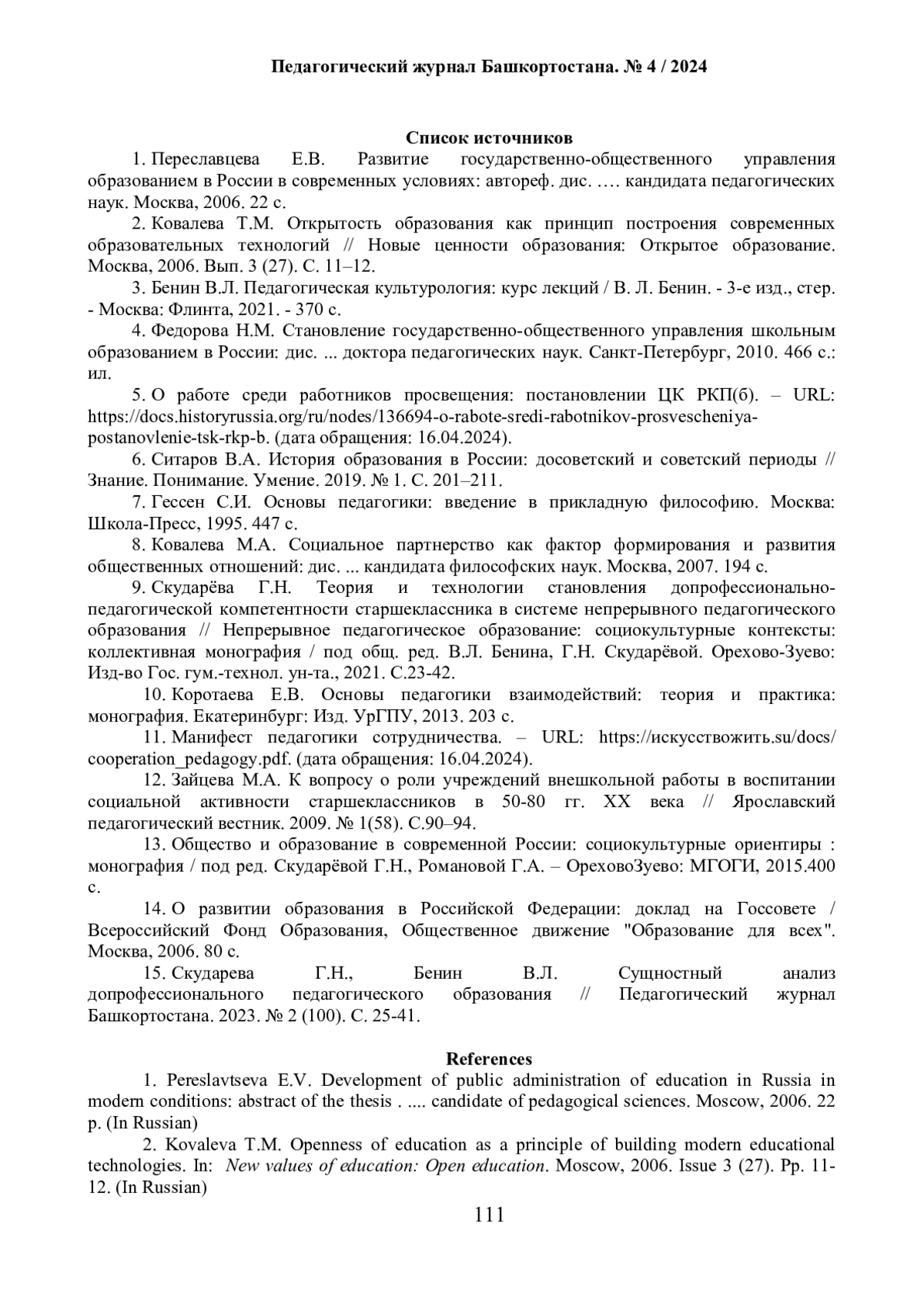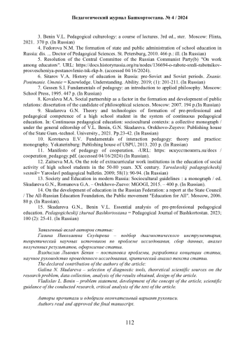 15. Скударева Г.Н., Бенин В.Л. Сущностный анализ допрофессионального педагогического образования // Педагогический журнал Башкортостана. 2023. № 2 (100). С. 25-41.