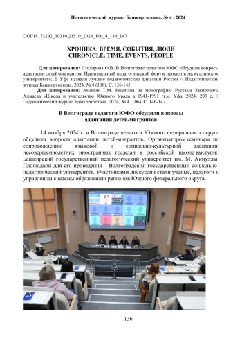 14 ноября 2024 г. в Волгограде педагоги Южного федерального округа обсудили вопросы адаптации детей-мигрантов. Организатором семинара по сопровождению языковой и социально-культурной адаптации несовершеннолетних иностранных граждан в российской школе выступил Башкирский государственный педагогический университет им. М. Акмуллы. Площадкой для его проведения – Волгоградский государственный социальнопедагогический университет. Участниками дискуссии стали ученые, педагоги и управленцы системы образовании регионов Южного федерального округа.