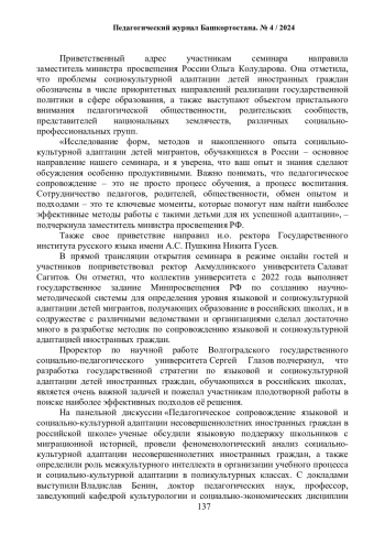 Приветственный адрес участникам семинара направила заместитель министра просвещения России Ольга Колударова. Она отметила, что проблемы социокультурной адаптации детей иностранных граждан обозначены в числе приоритетных направлений реализации государственной политики в сфере образования, а также выступают объектом пристального внимания педагогической общественности, родительских сообществ, представителей национальных землячеств, различных социальнопрофессиональных групп.