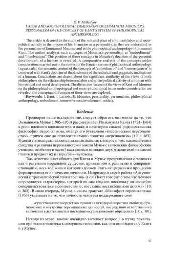 Статья посвящена исследованию роли и места трудовой и социально-политической деятельности человека в процессе становления его в качестве личности, как они понимаются в персонализме Эмманюэля Мунье и в философской антропологии Иммануила Канта. Анализируются такие понятия персонализма Мунье, как «воплощение» и «сопричастность». Раскрывается положение этих понятий в учении Мунье о личностном развитии человека. Проводится компаративистский анализ рассматриваемых понятий в контексте кантовской системы философской антропологии. В частности, сопоставляется смысловое содержание понятий «воплощение» и «сопричастность» с учением Канта о раскрытии технических и прагматических задатков человека. Делаются выводы о значительной схожести взглядов обоих философов на взаимосвязь трудовой и социально-политической деятельности человека с его духовно-нравственным развитием. Выявляются отличительные особенности взглядов Канта и Мунье на рассматриваемые философско-антропологическую и социально-философскую проблематики, исследуются концептуальные различия этих взглядов.