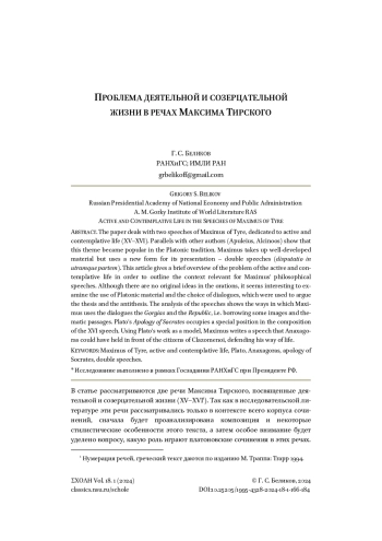 В статье рассматриваются две речи Максима Тирского, посвящённые активной и созерцательной жизни (XV–XVI). Параллели с другими авторами (Апулеем, Алкеновом) показывают, что эта тема стала популярной в платонической традиции. Максим использует хорошо проработанный материал, но применяет новую форму его изложения — двойные речи (disputatio in utramque partem). В этой статье представлен краткий обзор проблемы активной и созерцательной жизни, чтобы обозначить контекст, в котором следует рассматривать философские речи Максима. Несмотря на то, что в речах нет оригинальных идей, представляется интересным изучить использование платоновского материала и выбор диалогов, которые использовались для аргументации тезиса и антитезиса. Анализ речей показывает, как Максим использует диалоги «Горгий» и «Государство», заимствуя некоторые образы и тематические отрывки. «Апология Сократа» Платона занимает особое место в композиции шестнадцатой речи. Используя работу Платона в качестве образца, Максим пишет речь, которую Анаксагор мог бы произнести перед жителями Клазомен, защищая свой образ жизни.