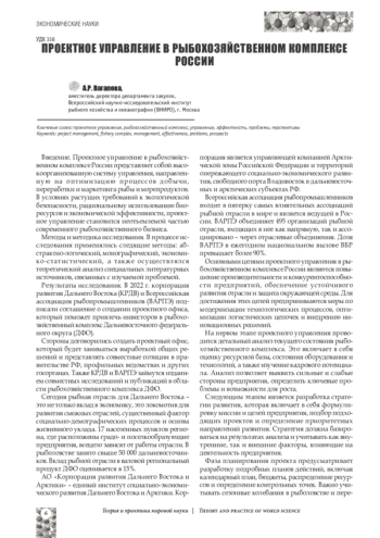 В статье анализируются особенности проектного управления в рыбохозяйственном комплексе России. Автор особо подчеркивает, что проектное управление является ключевым инструментом для обеспечения устойчивого развития отрасли. Оно позволяет оптимизировать производственные процессы, повысить эффективность использования ресурсов, создать конкурентоспособные продукты и минимизировать негативное воздействие на окружающую среду. Внедрение современных методов управления и инновационных технологий открывает перед отраслью новые возможности и перспективы, способствуя её интеграции в мировую экономику и укреплению позиций на международном рынке.