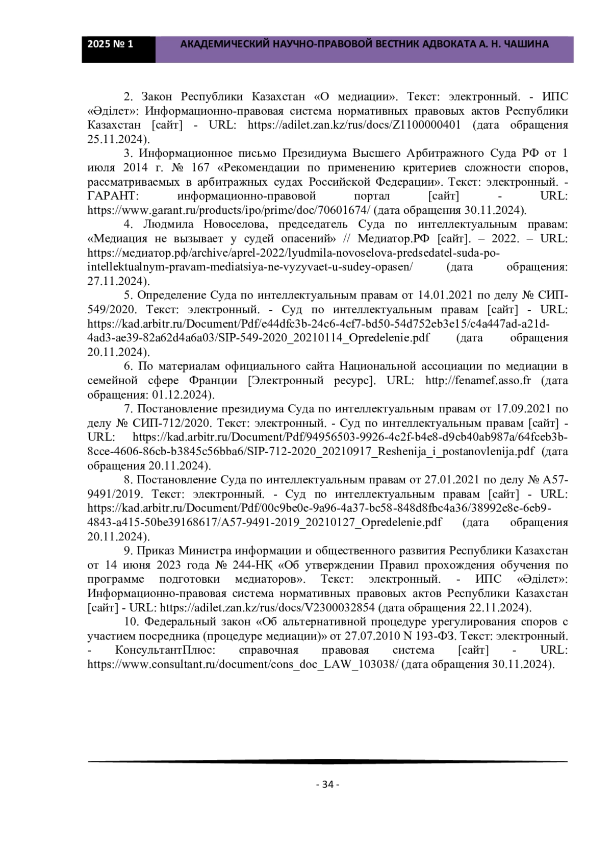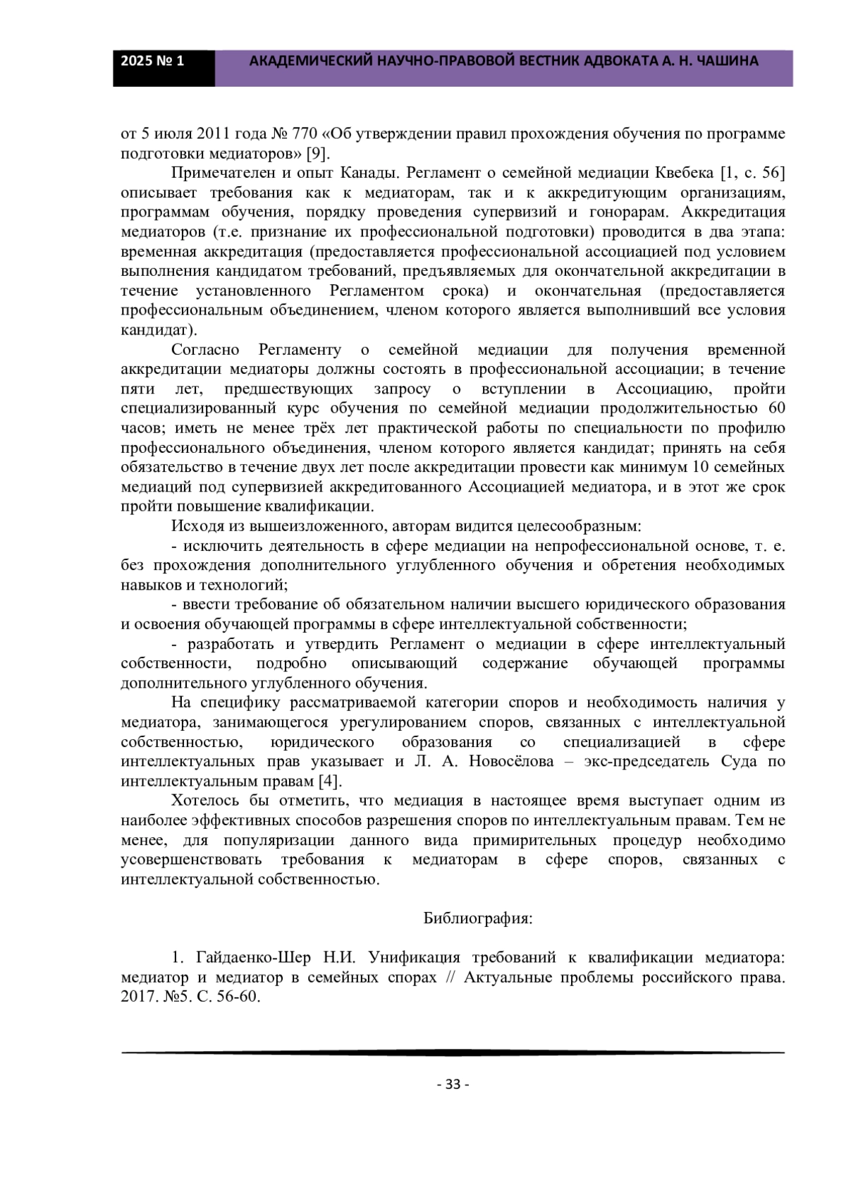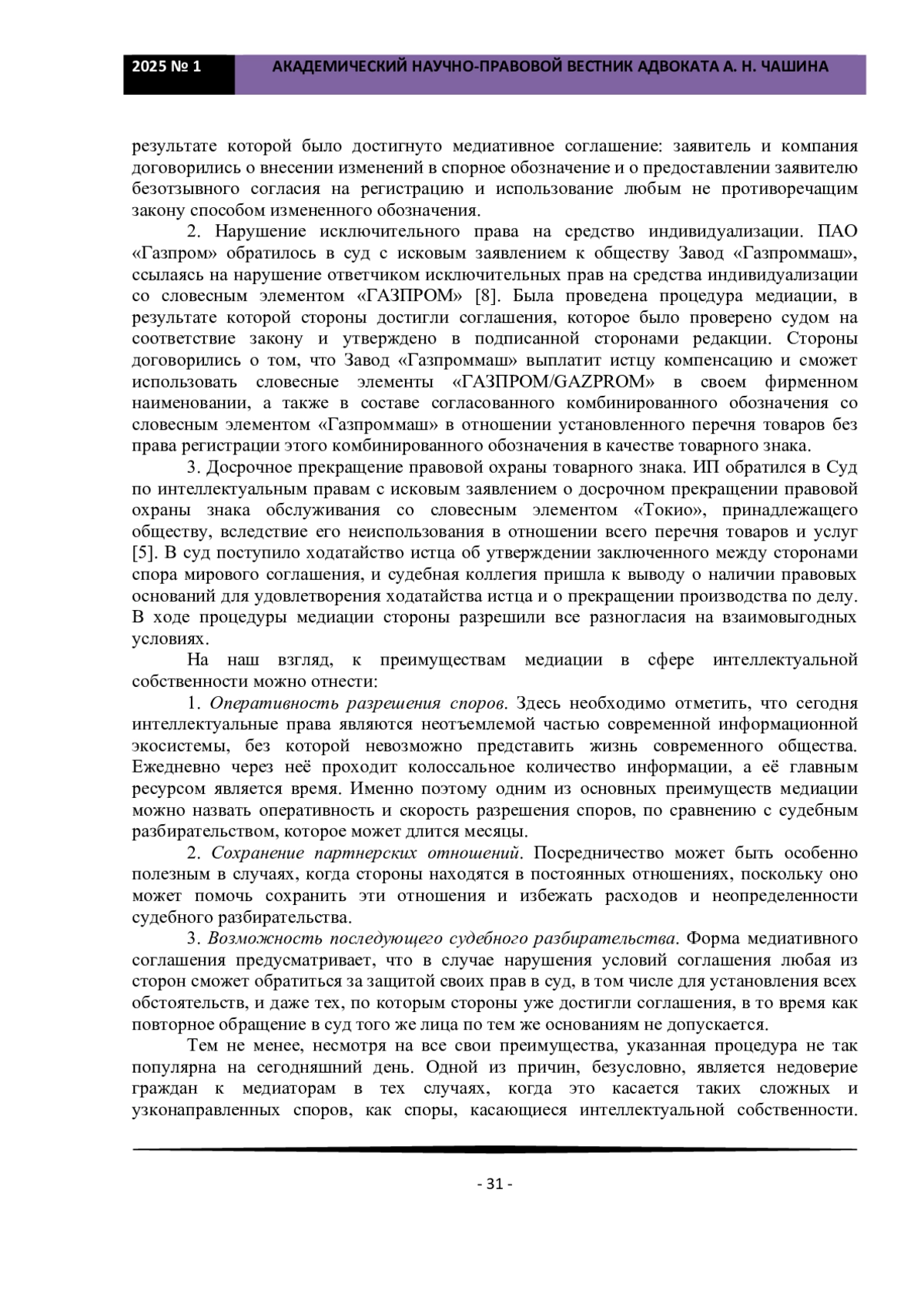 Статья посвящена анализу опыта применения процедуры медиации для разрешения споров в сфере интеллектуальной собственности. Авторами рассматриваются вопросы специализации медиаторов. Делается вывод о необходимости усовершенствования требований к медиаторам в сфере интеллектуальной собственности. Проанализированы достоинства и недостатки, а также перспективные направления применения медиативных процедур в сфере интеллектуальной собственности. Выявлены основные тенденции развития института медиации в России.
