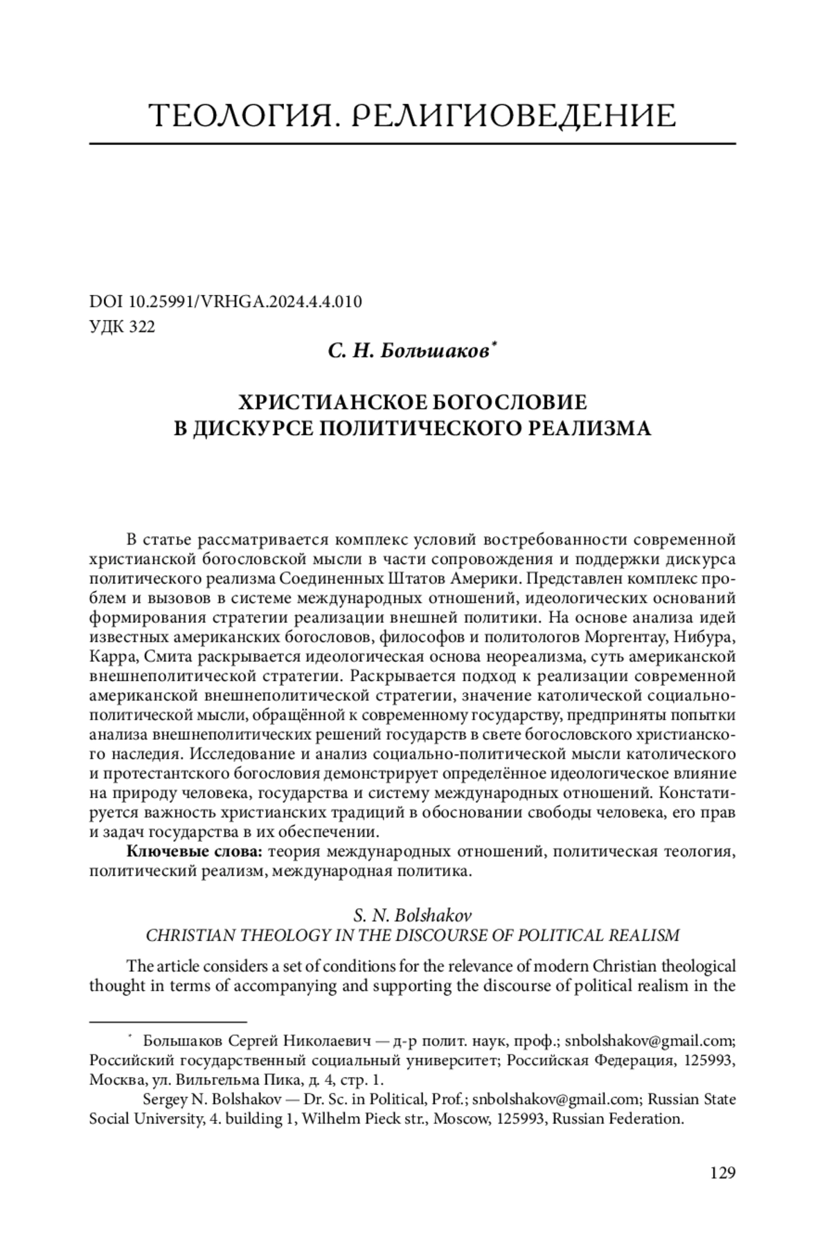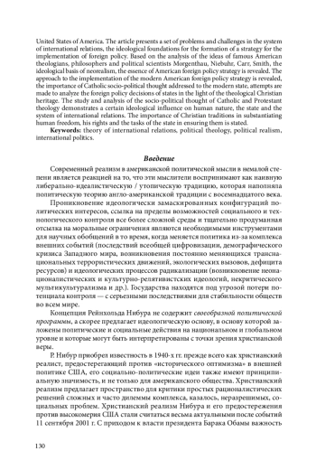 В статье рассматривается комплекс условий востребованности современной христианской богословской мысли в части сопровождения и поддержки дискурса политического реализма Соединенных Штатов Америки. Представлен комплекс проблем и вызовов в системе международных отношений, идеологических оснований формирования стратегии реализации внешней политики. На основе анализа идей известных американских богословов, философов и политологов Моргентау, Нибура, Карра, Смита раскрывается идеологическая основа неореализма, суть американской внешнеполитической стратегии. Раскрывается подход к реализации современной американской внешнеполитической стратегии, значение католической социально-политической мысли, обращённой к современному государству, предприняты попытки анализа внешнеполитических решений государств в свете богословского христианского наследия. Исследование и анализ социально-политической мысли католического и протестантского богословия демонстрирует определённое идеологическое влияние на природу человека, государства и систему международных отношений. Констатируется важность христианских традиций в обосновании свободы человека, его прав и задач государства в их обеспечении.