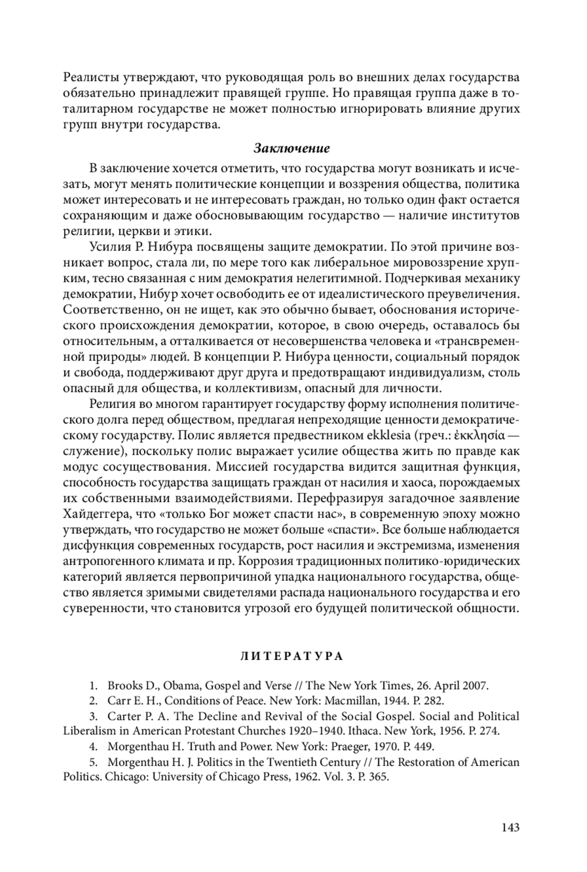 5. Morgenthau H. J. Politics in the Twentieth Century // The Restoration of American Politics. Chicago: University of Chicago Press, 1962. Vol. 3.
