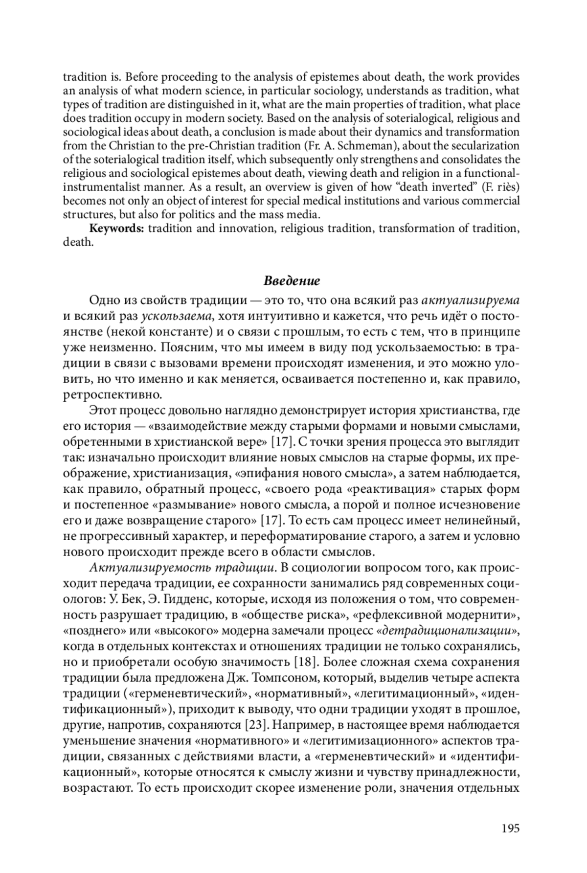 В статье рассматривается вопрос о традиции смерти в трех эпистемологических измерениях: сотериологическом, религиоведческом, социологическом. Ставится цель изучить традицию применительно к конкретному явлению, смерти, и таким образом установить, что такое смерть и какова ее традиция(и). Прежде, чем приступить к анализу эпистем о смерти, в работе дается разбор того, что понимает под традицией современная наука, в частности, социология, какие виды традиции в ней выделяют, каковы основные свойства традиции, какое место традиция занимает в современном обществе. На основании разбора сотериологических, религиоведческих и социологических представлений о смерти делается вывод об их динамике и трансформации от христианской к дохристианской традиции (свщ. А. Шмеман), о секуляризации самой сотериологической традиции, что впоследствии только усиливают и закрепляют религиоведческая и социологическая эпистемы о смерти, рассматривая смерть и религию в функционально-инструменталистском ключе. В итоге дается обзор того, как «смерть перевернутая» (Ф. Арьес) становится постепенно не только предметом интереса специальных медицинских учреждений, различных коммерческих структур, но и политики, массмедиа.