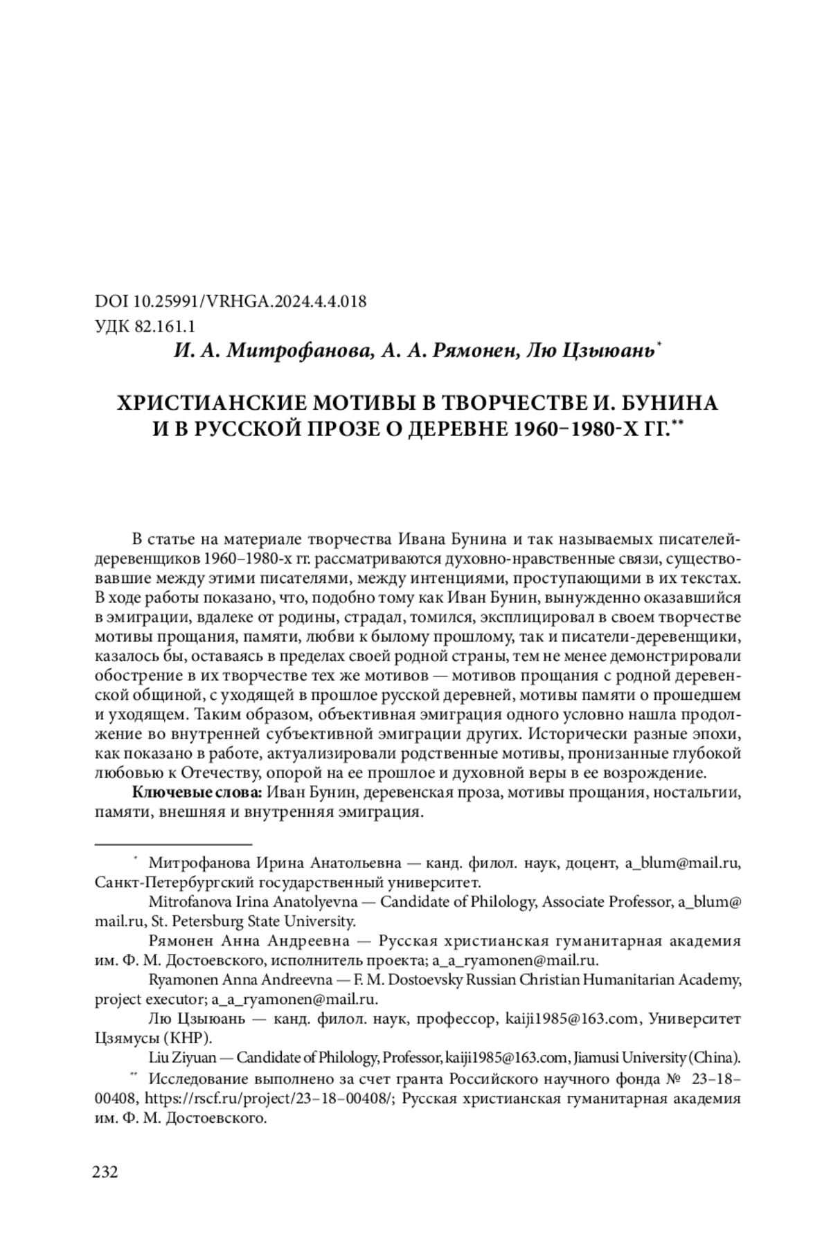 В статье на материале творчества Ивана Бунина и так называемых писателейдеревенщиков 1960-1980-х гг. рассматриваются духовно-нравственные связи, существовавшие между этими писателями, между интенциями, проступающими в их текстах. В ходе работы показано, что, подобно тому как Иван Бунин, вынужденно оказавшийся в эмиграции, вдалеке от родины, страдал, томился, эксплицировал в своем творчестве мотивы прощания, памяти, любви к былому прошлому, так и писатели-деревенщики, казалось бы, оставаясь в пределах своей родной страны, тем не менее демонстрировали обострение в их творчестве тех же мотивов - мотивов прощания с родной деревенской общиной, с уходящей в прошлое русской деревней, мотивы памяти о прошедшем и уходящем. Таким образом, объективная эмиграция одного условно нашла продолжение во внутренней субъективной эмиграции других. Исторически разные эпохи, как показано в работе, актуализировали родственные мотивы, пронизанные глубокой любовью к Отечеству, опорой на ее прошлое и духовной веры в ее возрождение.