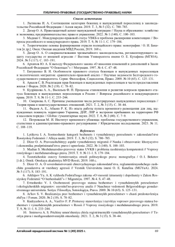 1. Лытикова И. А. Соотношение категории беженец и вынужденный переселенец в законодательстве Российской Федерации // Аллея науки. 2019. Т. 3, № 5 (32). С. 780-785. EDN: CWYGXP