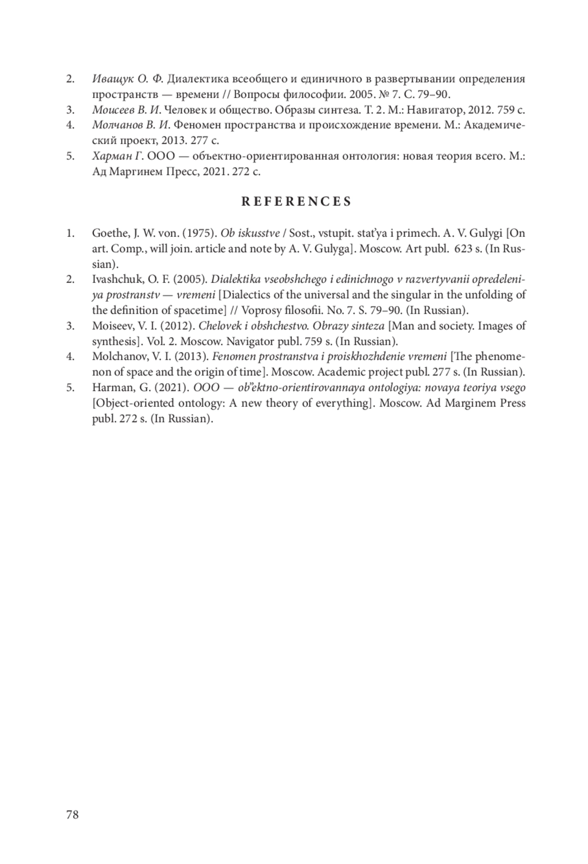 1. Гёте И. В. Об искусстве. Сост., вступит. статья и примеч. А. В. Гулыги. М.: Искусство, 1975. 623 с. 2. Иващук О. Ф. Диалектика всеобщего и единичного в развертывании определения пространств - времени // Вопросы философии. 2005. № 7. С. 79-90. EDN: HRZMNZ