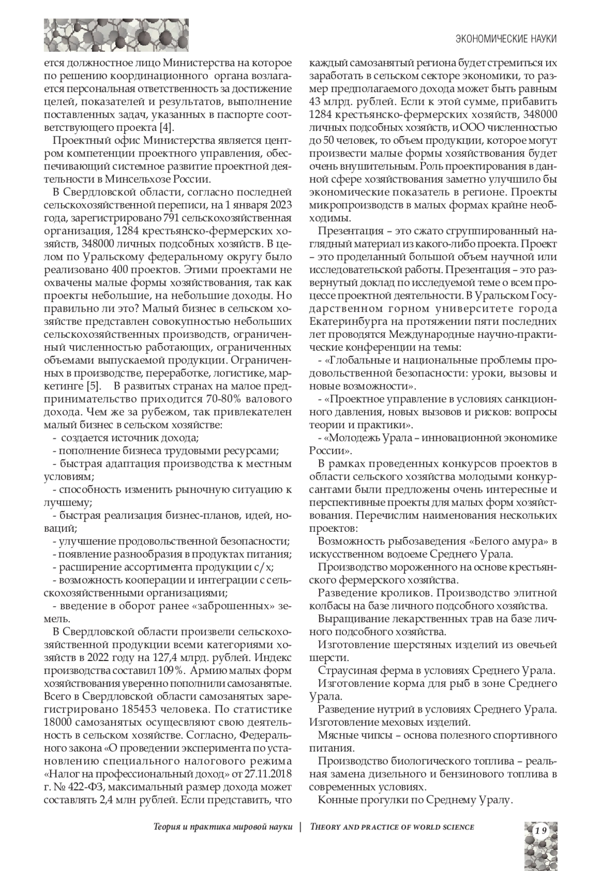 В Свердловской области, согласно последней сельскохозяйственной переписи, на 1 января 2023 года, зарегистрировано 791 сельскохозяйственная организация, 1284 крестьянско-фермерских хозяйств, 348000 личных подсобных хозяйств. В целом по Уральскому федеральному округу было реализовано 400 проектов. Этими проектами не охвачены малые формы хозяйствования, так как проекты небольшие, на небольшие доходы. Но правильно ли это? Малый бизнес в сельском хозяйстве представлен совокупностью небольших сельскохозяйственных производств, ограниченный численностью работающих, ограниченных объемами выпускаемой продукции. Ограниченных в производстве, переработке, логистике, маркетинге [5].