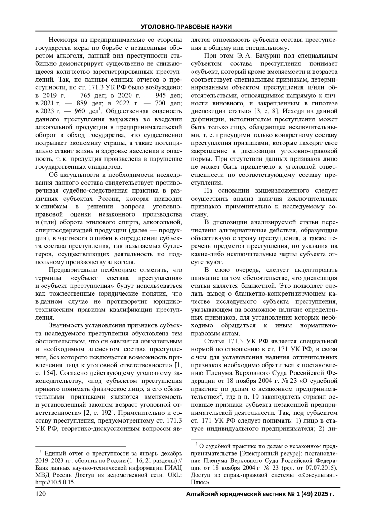 Несмотря на предпринимаемые со стороны государства меры по борьбе с незаконным оборотом алкоголя, данный вид преступности стабильно демонстрирует существенно не снижающееся количество зарегистрированных преступлений. Так, по данным единых отчетов о преступности, по ст. 171.3 УК РФ было возбуждено: в 2019 г. — 765 дел; в 2020 г. — 945 дел; в 2021 г. — 889 дел; в 2022 г. — 700 дел; в 2023 г. — 960 дел1. Общественная опасность данного преступления выражена во введении алкогольной продукции в предпринимательский оборот в обход государства, что существенно подрывает экономику страны, а также потенциально ставит жизнь и здоровье населения в опасность, т. к. продукция произведена в нарушение государственных стандартов.