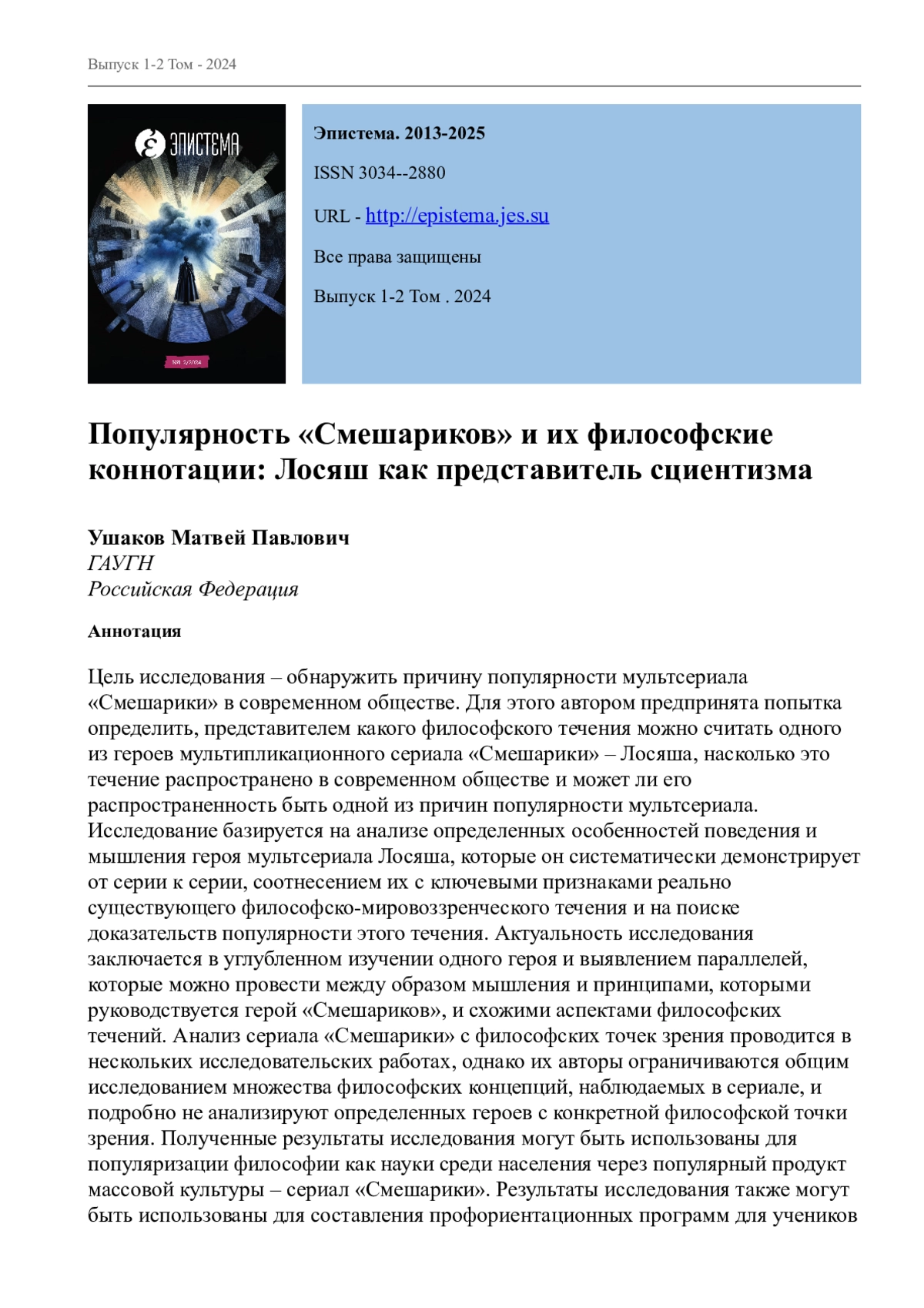 Ушаков М. П. Популярность «Смешариков» и их философские коннотации: Лосяш как представитель сциентизма // Эпистема. – 2024. – Выпуск 1-2. URL: https://epistema. jes. su/s0033290-9-1/. DOI: 10.18254/S0033290-9 Мы живем в эпоху доминирования в массовой культуре произведенийоднодневок. А «Смешарики» вот уже двадцать лет остаются популярными как среди целевой аудитории – детей, так и среди взрослых, причем не только в России, но и по всему миру. В рамках данного исследования я постараюсь разобраться в некоторых причинах такой беспрецедентной популярности медийного продукта и выяснить, какое отношение она имеет к философским идеям, которые распространены в современном общественном сознании. Моя гипотеза – своей популярностью и долгому существованию в медийном поле «Смешарики» обязаны в том числе и философским идеям, которые востребованы в современном обществе.