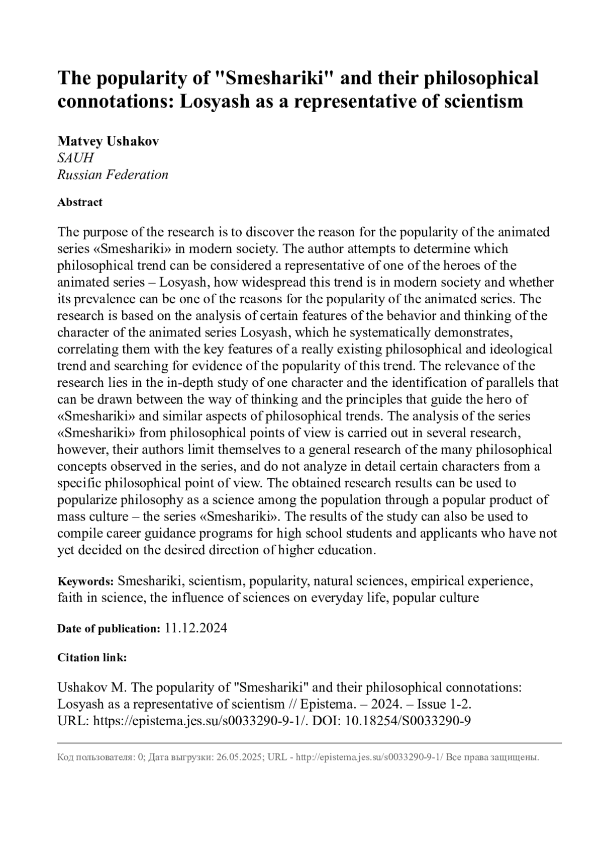 Цель исследования - обнаружить причину популярности мультсериала «Смешарики» в современном обществе. Для этого автором предпринята попытка определить, представителем какого философского течения можно считать одного из героев мультипликационного сериала «Смешарики» - Лосяша, насколько это течение распространено в современном обществе и может ли его распространенность быть одной из причин популярности мультсериала. Исследование базируется на анализе определенных особенностей поведения и мышления героя мультсериала Лосяша, которые он систематически демонстрирует от серии к серии, соотнесением их с ключевыми признаками реально существующего философско-мировоззренческого течения и на поиске доказательств популярности этого течения. Актуальность исследования заключается в углубленном изучении одного героя и выявлением параллелей, которые можно провести между образом мышления и принципами, которыми руководствуется герой «Смешариков», и схожими аспектами философских течений. Анализ сериала «Смешарики» с философских точек зрения проводится в нескольких исследовательских работах, однако их авторы ограничиваются общим исследованием множества философских концепций, наблюдаемых в сериале, и подробно не анализируют определенных героев с конкретной философской точки зрения. Полученные результаты исследования могут быть использованы для популяризации философии как науки среди населения через популярный продукт массовой культуры - сериал «Смешарики». Результаты исследования также могут быть использованы для составления профориентационных программ для учеников старших классов и абитуриентов, еще не определившихся с желаемым направлением высшего образования.