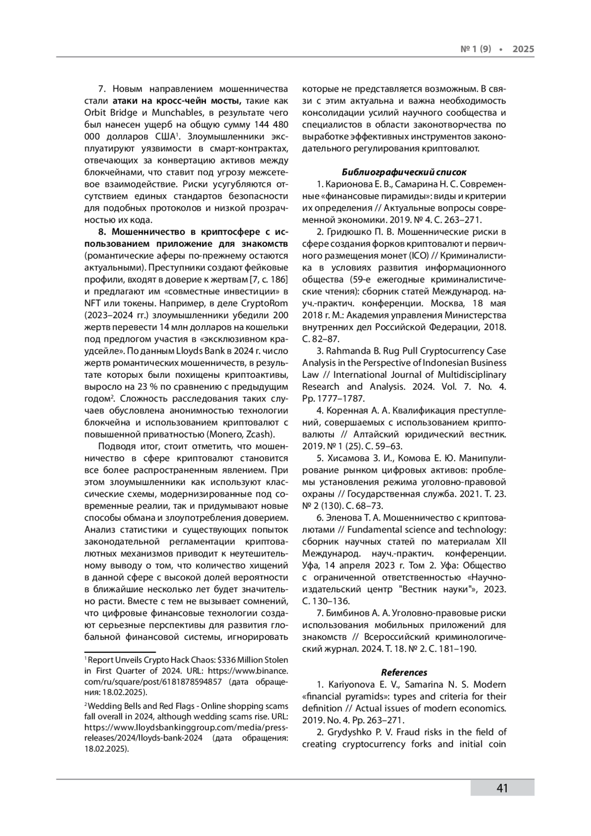 6. Эленова Т. А. Мошенничество с криптовалютами // Fundamental science and technology: сборник научных статей по материалам XII Международ. науч.-практич. конференции. Уфа, 14 апреля 2023 г. Том 2. Уфа: Общество с ограниченной ответственностью «Научно- издательский центр “Вестник науки”», 2023. С. 130–136.