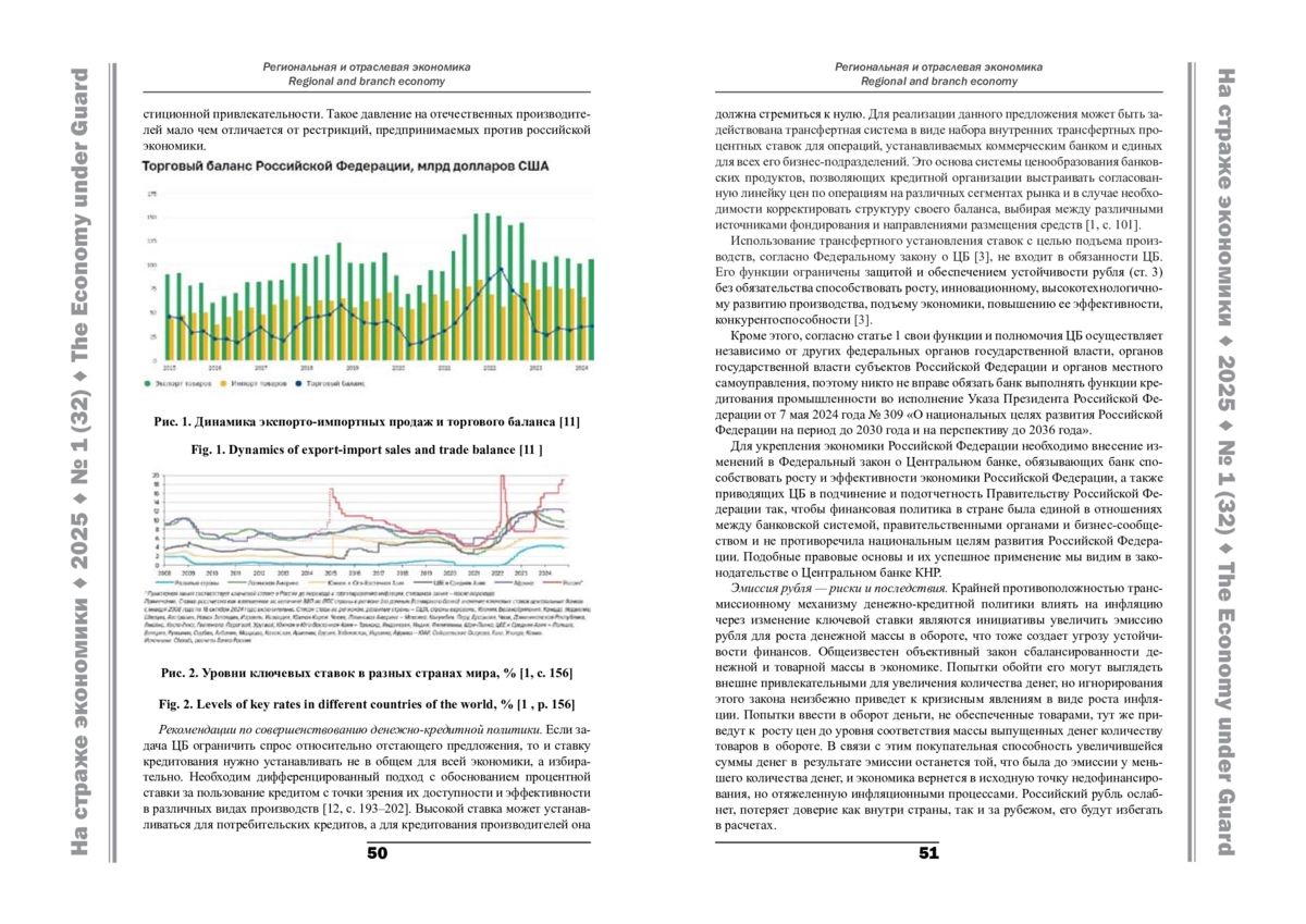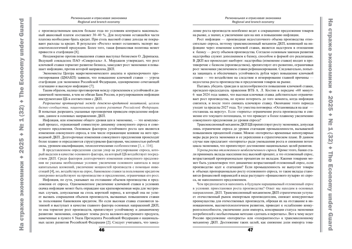 В статье рассмотрены особенности денежно-кредитной политики и ее влияние на развитие экономики с точки зрения интересов производителей, Банка России, национальных целей развития Российской Федерации. Выявлены противоречия между ними. Исследовано влияние действующего трансмиссионного механизма денежно-кредитной политики на развитие экономики в условиях современных вызовов, рисков и угроз с помощью диалектического подхода с использованием категорий базиса и надстройки, причины и следствия фундаментальных законов развития экономики, методов статистических сравнений и нормативных документов. Даны рекомендации по разрешению указанных противоречий, достижению согласованного участия правительства, бизнес-сообщества, денежно-кредитной политики Банка России и образовательных организаций в достижении национальных целей развития российской экономики на основе внесения изменений в законодательство. Предложены оптимальные меры по регулированию ставки рефинансирования с помощью трансфертной системы денежно-кредитной политики.