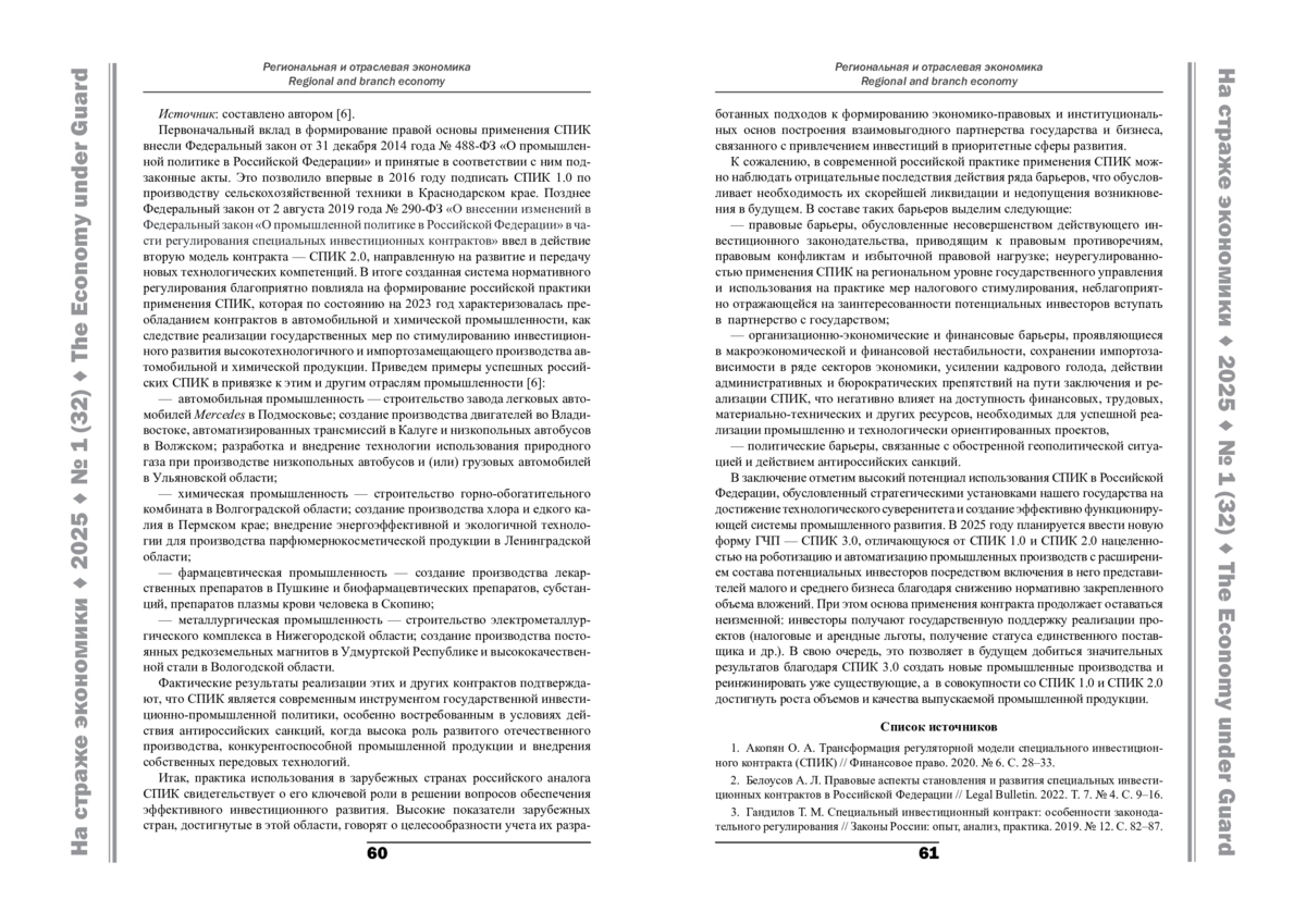1. Акопян О. А. Трансформация регуляторной модели специального инвестиционного контракта (СПИК) // Финансовое право. 2020. № 6. С. 28–33.