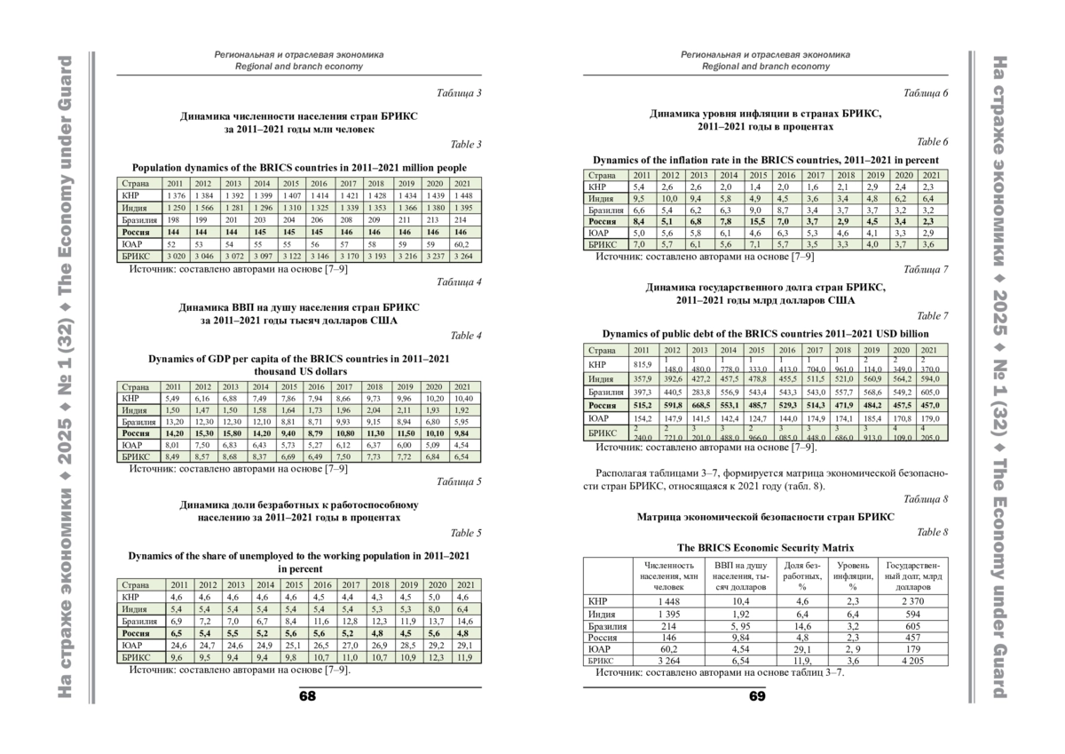 1. Алексеев Ю. П. Сравнительный анализ экономического роста стран БРИКС // Вопросы экономики. 2022. № 3. С. 14–17.
