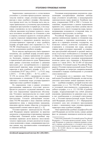 Закрепленное законодателем в отечественном уголовном и уголовно-процессуальном законодательстве понятие «меры уголовно-правового характера в виде судебного штрафа» обуславливалось прежде всего тем, что большая часть лиц, которые привлекались к уголовному преследованию, совершали преступление в первый раз, в последующем становились на путь исправления, а после отбытия наказания полученная судимость оказывала негативное воздействие на отношение к ним в социуме, возникали трудности с поиском работы и другие социально направленные проблемы, что в дальнейшем и определило развитие института уголовно-правового характера в виде судебного штрафа, который нашел свое отражение в ст. 76.2 УК РФ «Освобождение от уголовной ответственности с назначением судебного штрафа».