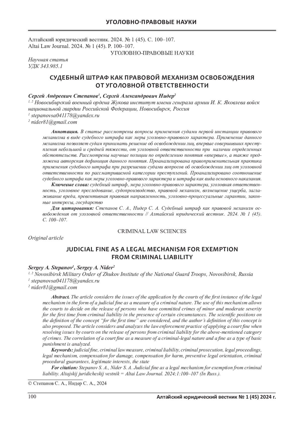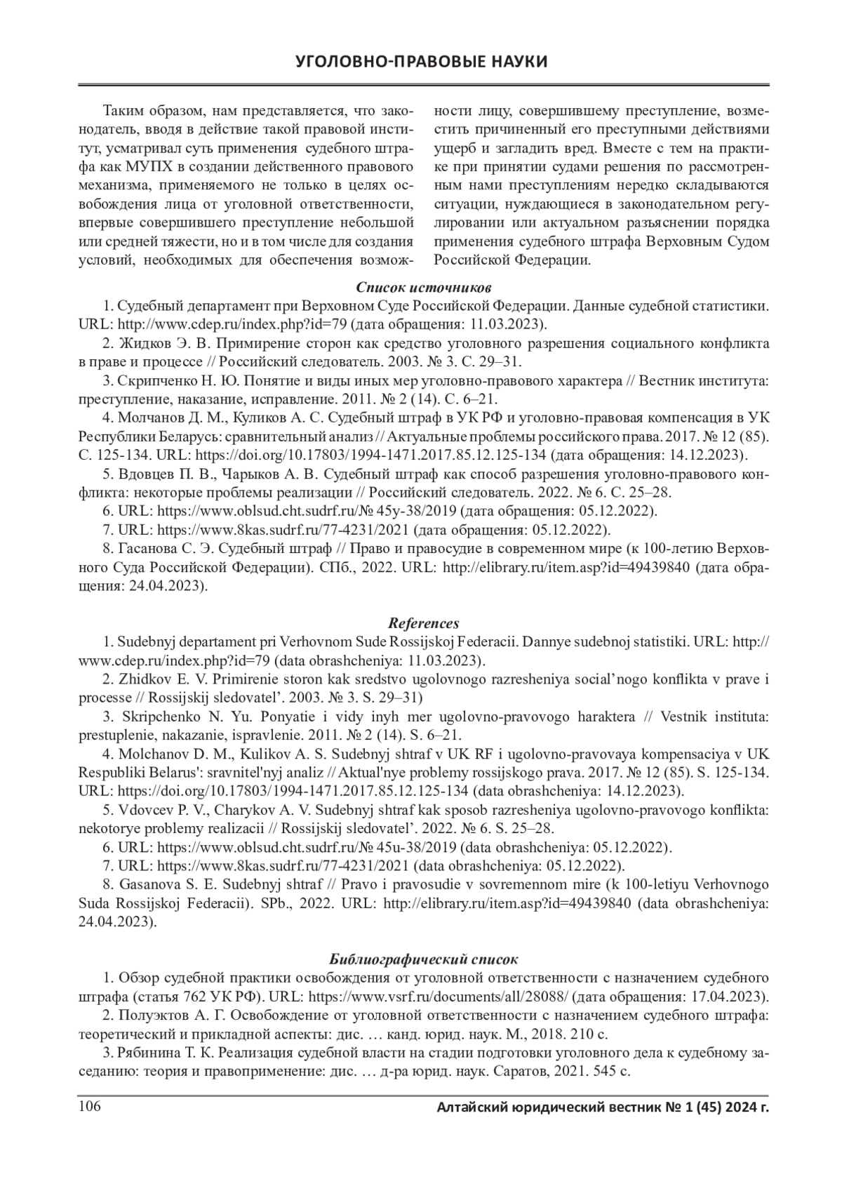 4. Молчанов Д. М., Куликов А. С. Судебный штраф в УК РФ и уголовно-правовая компенсация в УК Республики Беларусь: сравнительный анализ // Актуальные проблемы российского права. 2017. № 12 (85). С. 125-134.URL:дата обращения:14.12.2023). DOI: 10.17803/1994-1471.2017.85.12.125-134( EDN: YLYGEH