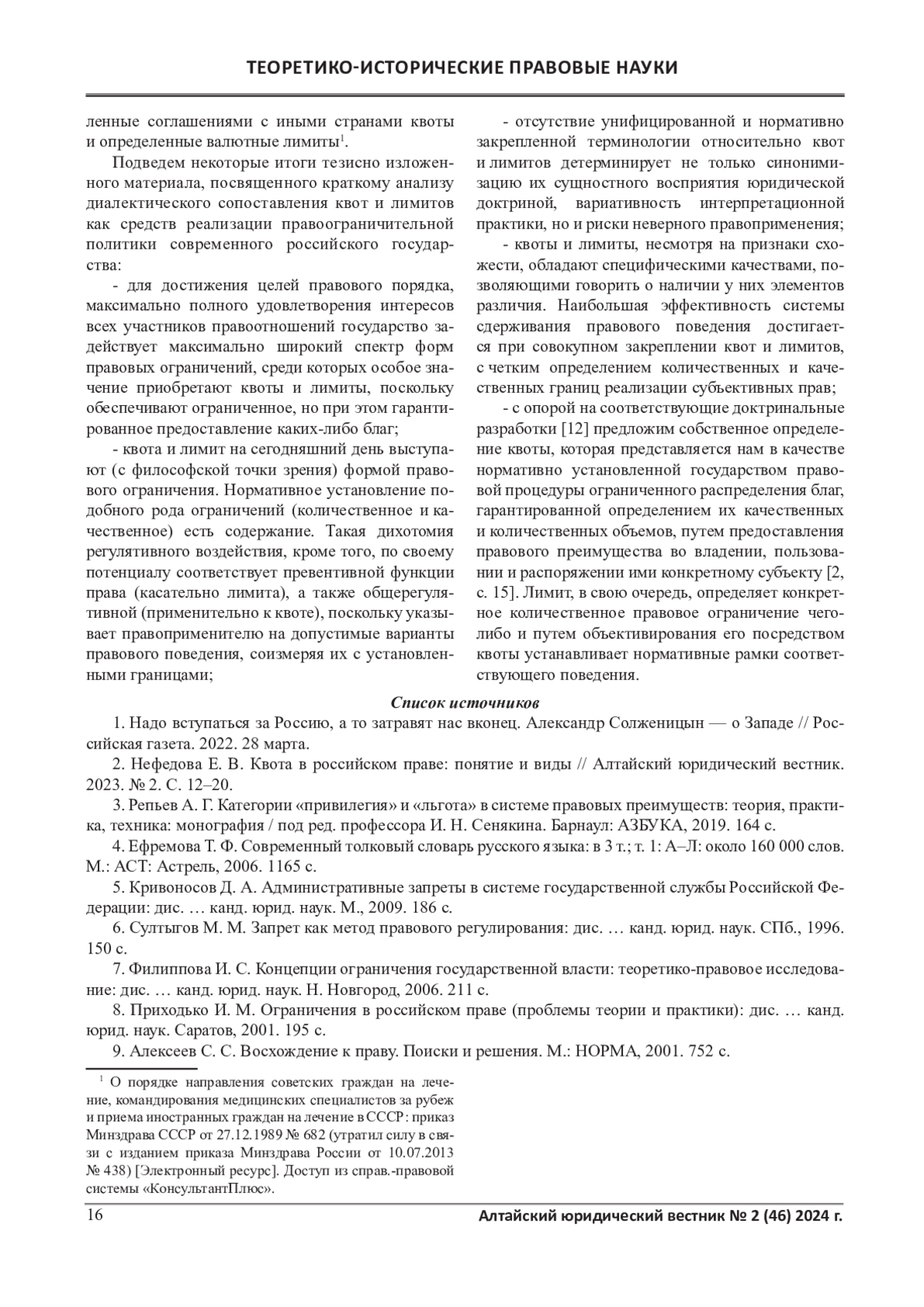 2. Нефедова Е. В. Квота в российском праве: понятие и виды // Алтайский юридический вестник. 2023. № 2. С. 12-20. EDN: YAWWAW