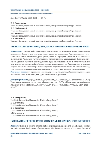 в данной работе исследуется интеграция производства, науки и образования как ключевой фактор для инновационного развития экономики. Рассматриваются теоретические аспекты ноономики, роль университетов в процессе развития, а также практический опыт Уральского государственного экономического университета. Основное внимание уделено стратегии взаимодействия вуза с промышленными и образовательными партнерами, направленной на формирование компетенций, необходимых для успешного социально-экономического развития. В работе подчеркивается важность системного подхода для повышения конкурентоспособности и адаптации к вызовам современности.