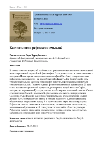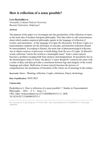 В статье ставится вопрос об особенностях рефлексии смысла в качестве основной идеи современной европейской философии. Эта идея отсылает к самосознанию, о котором в Новое время эмпирическая философия (Дж. Локк) говорит на языке рефлексии, рационализм - на языке Cogito (Р. Декарт). Для Канта Сogito есть трансцендентальное условие образования понятий, и рефлексия должна быть трансцендентальной. Главной задачей феноменологической рефлексии в 20 веке стало выявление сущностей процессов, усмотрение вещей из актов Cogito, которое, по выражению Гуссерля, «несет в себе мир как значимый смысл». Смысл становится проблемой, искомым X, убегающим от анализа, интерпретации. Особенность рефлексии в деонтологизации смысла: словосочетание «смысл должен быть» переводит его бытие в область должного, а долженствование обеспечивает корреляцию между Я и целостностью мира, языка и культуры. Рефлексия смысла становится осмыслением, соотнесением с целостностью, механизмом образования всей совокупности значений в области культуры. Рефлексия смысла становится осмыслением, соотнесением с целостностью, механизмом образования всей совокупности значений.