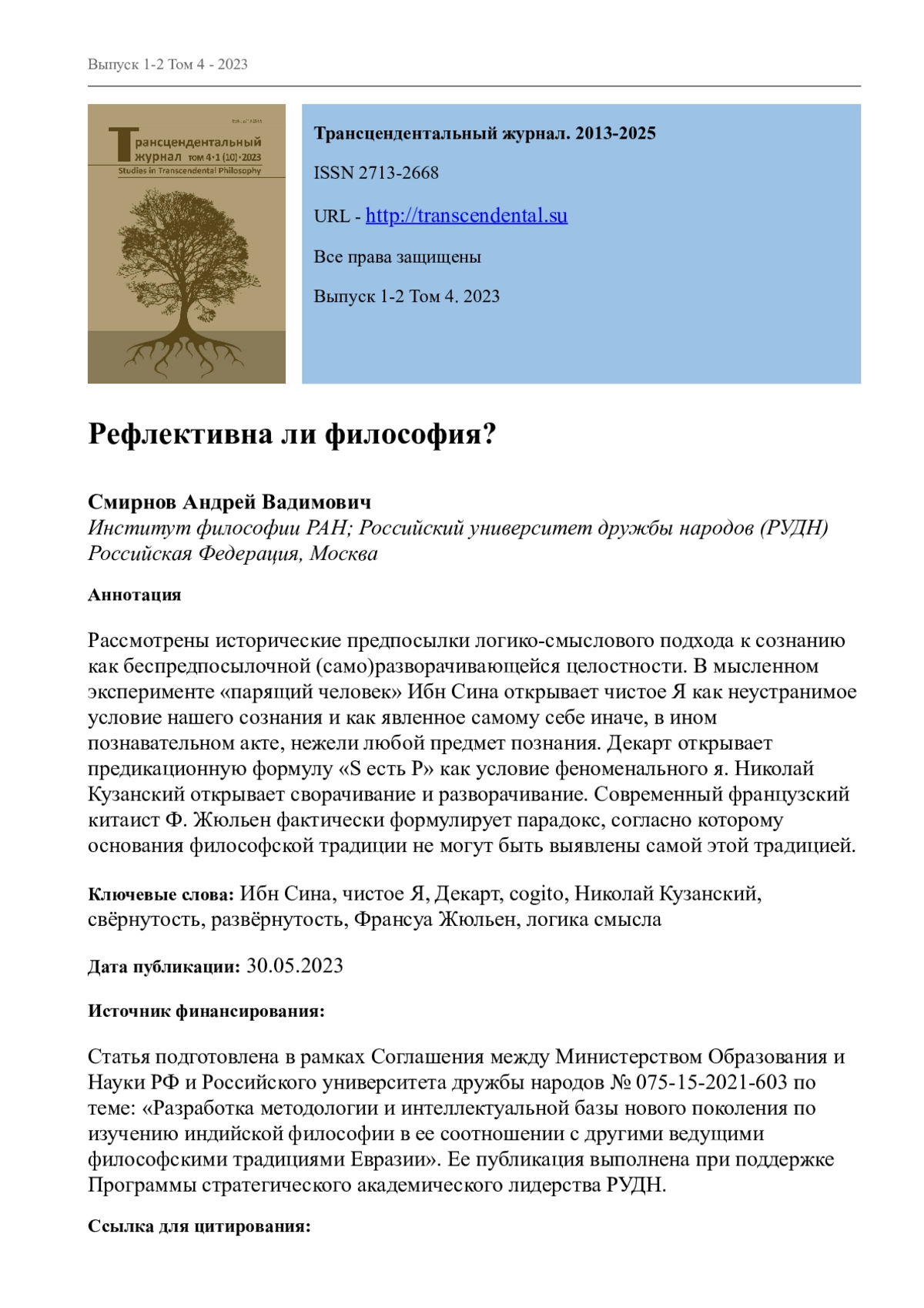 Рассмотрены исторические предпосылки логико-смыслового подхода к сознанию как беспредпосылочной (само)разворачивающейся целостности. В мысленном эксперименте «парящий человек» Ибн Сина открывает чистое Я как неустранимое условие нашего сознания и как явленное самому себе иначе, в ином познавательном акте, нежели любой предмет познания. Декарт открывает предикационную формулу «S есть P» как условие феноменального я. Николай Кузанский открывает сворачивание и разворачивание. Современный французский китаист Ф. Жюльен фактически формулирует парадокс, согласно которому основания философской традиции не могут быть выявлены самой этой традицией.