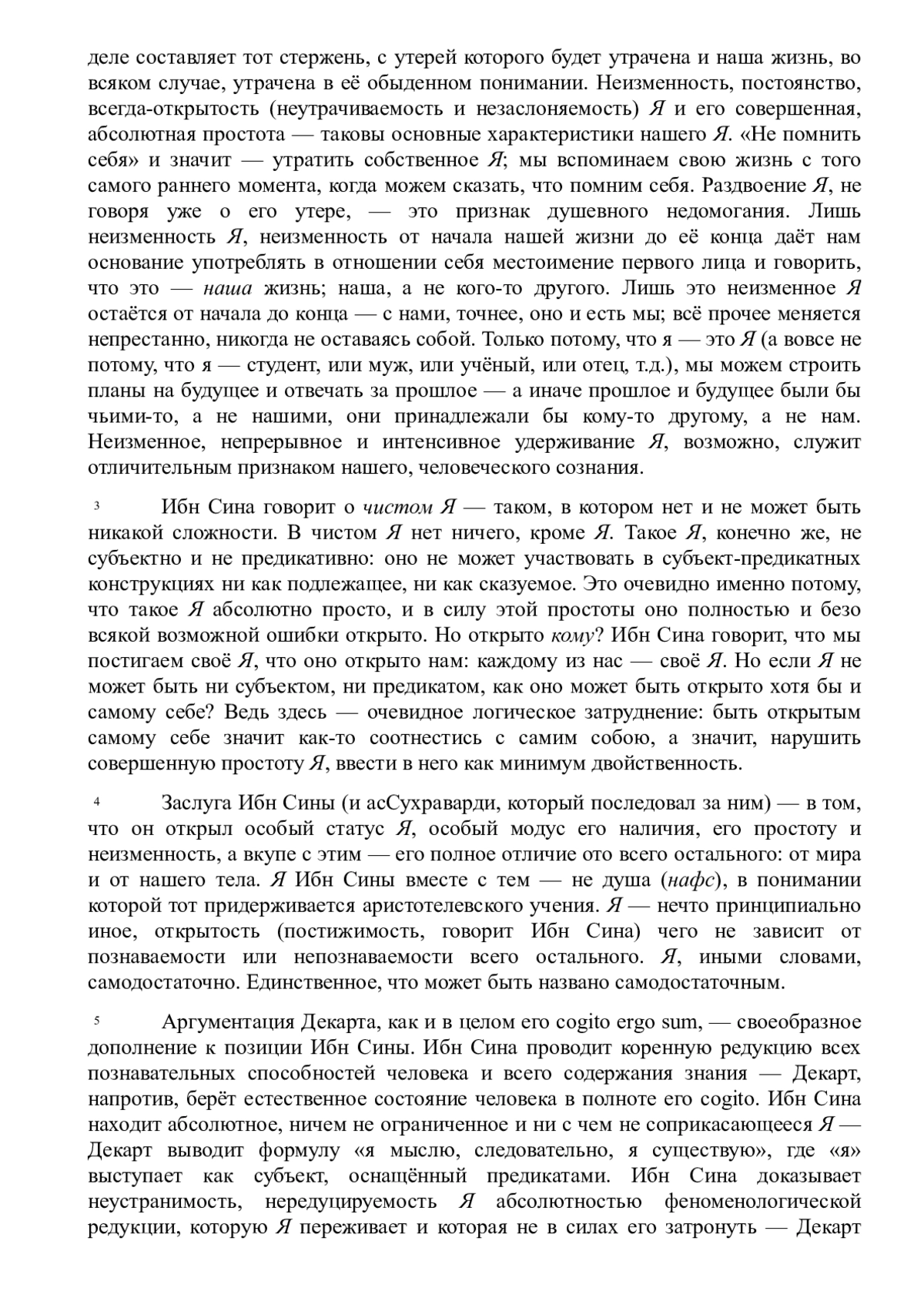 В своём мысленном эксперименте «парящий человек» (см. подробнее: [1, с. 35-38]1]) Ибн Сина (980-1037) предложил представить человека лишённым всех признаваемых философией источников знания. Он задаёт условия этого мысленного эксперимента в соответствии со своими воззрениями: Ибн Сина был представителем фальсафы и придерживался аристотелевской теории познания. Поэтому он предлагает представить, что человек лишён памяти (нет хранилища форм, унаследованных от прежнего познавательного опыта: человек лишён внутреннего источника разумных форм), лишён возможности чувственно постигать внешний мир и собственное тело (никакие разумные формы не поступают извне). Представь себе, говорит Ибн Сина, обращаясь к читателю, что ты только что сотворён (значит, заключаем в скобки память), что тело твоё в чистом воздухе (Ибн Сина не признаёт пустоты, и «чистый воздух» — ближайший аналог вакуума: так берём в скобки весь внешний мир) таким образом, что одни части твоего тела не касаются других (Ибн Сина не забывает взять в скобки и собственное тело). Так мы совершаем полную феноменологическую редукцию, очищаем сознание и устраняем все возможные источники получения нового знания.