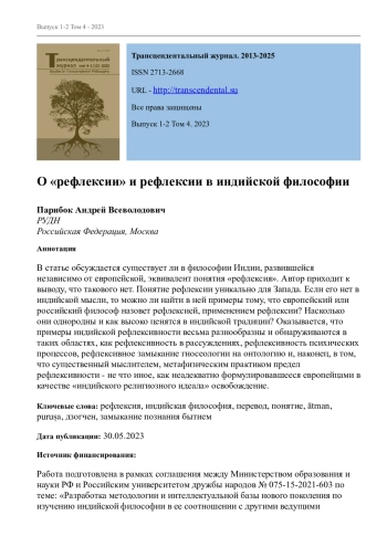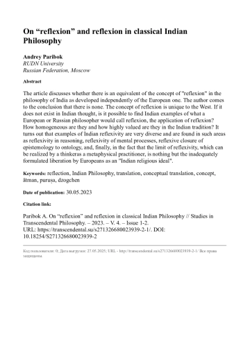 В статье обсуждается существует ли в философии Индии, развившейся независимо от европейской, эквивалент понятия «рефлексия». Автор приходит к выводу, что такового нет. Понятие рефлексии уникально для Запада. Если его нет в индийской мысли, то можно ли найти в ней примеры тому, что европейский или российский философ назовет рефлексией, применением рефлексии? Насколько они однородны и как высоко ценятся в индийской традиции? Оказывается, что примеры индийской рефлексивности весьма разнообразны и обнаруживаются в таких областях, как рефлексивность в рассуждениях, рефлексивность психических процессов, рефлексивное замыкание гносеологии на онтологию и, наконец, в том, что существенный мыслителем, метафизическим практиком предел рефлексивности - не что иное, как неадекватно формулировавшееся европейцами в качестве «индийского религиозного идеала» освобождение.