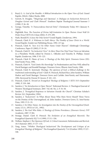 12. Pinnock. Clark H. Systematic Theology. The openness of God: a biblical challenge to the traditional understanding of God / Clark H. Pinnock, Richard Rice, John Sanders, William Hasker and David Basinger. Downers Grove and Carlisle: InterVarsity and Paternoster, 1994. Reviewed by Dennis W. Jowers. Р. 101-125.