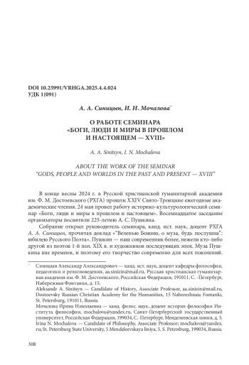 В конце весны 2024 г. в Русской христианской гуманитарной академии им. Ф. М. Достоевского (РХГА) прошли XXIV Свято-Троицкие ежегодные академические чтения. 24 мая провел работу историко-культурологический семинар «Боги, люди и миры в прошлом и настоящем». Восемнадцатое заседание организаторы посвятили 225-летию А. С. Пушкина.