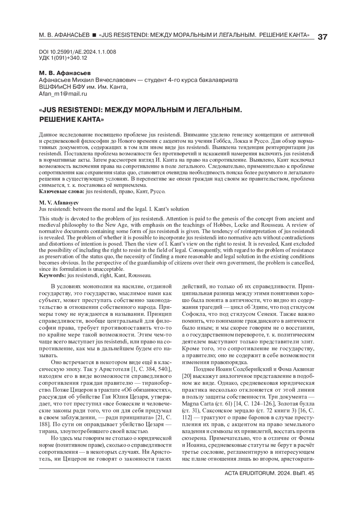 Данное исследование посвящено проблеме jus resistendi. Внимание уделено генезису концепции от античной и средневековой философии до Нового времени с акцентом на учения Гоббса, Локка и Руссо. Дан обзор нормативных документов, содержащих в том или ином виде jus resistendi. Выявлена тенденция рентерпритации jus resistendi. Поставлена проблема возможности без противоречий и искажений намерения включить jus resistendi в нормативные акты. Затем рассмотрен взгляд И. Канта на право на сопротивление. Выявлено, Кант исключал возможность включения права на сопротивление в поле легального. Следовательно, применительно к проблеме сопротивления как сохранения status quo, становится очевидна необходимость поиска более разумного и легального решения в существующих условиях. В перспективе же опеки граждан над своим же правительством, проблема снимается, т. к. постановка её неприемлема.