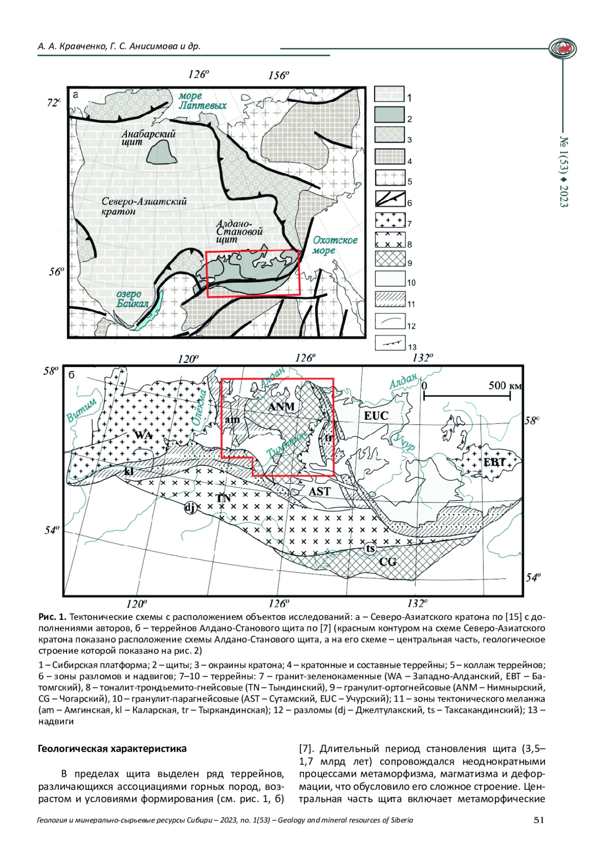 Алдано-Становой щит представляет собой крупнейший выступ фундамента Северо-Азиатского (Сибирского) кратона (рис. 1, а) с широким развитием гранит-зеленокаменных и гранулитгнейсовых комплексов. Несмотря на то что щит является одним из наиболее важных горнорудных регионов России, в силу своей удаленности и труднодоступности он изучен в значительно меньшей мере, чем другие докембрийские территории. В раннедокембрийских комплексах центральной части щита наиболее характерными полезными ископаемыми являются магнетитовые руды, флогопит, апатит и пьезокварц, но до недавнего времени не было выявлено месторождений золота, хотя определенные предпосылки для этого существовали [3]. Только в последние десятилетия геологами предприятия «Якутскгеология» в кристаллических сланцах основного состава на территории Нимнырского террейна (см. рис. 1, б) были открыты первое промышленное месторождение золота им. П. Пинигина и рудное поле Бривас, сделавшие актуальным проведение геологического доизучения территории и тематические научные исследования.
