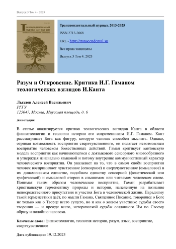 В статье анализируется критика теологических взглядов Канта в области физикотеологии и теологии истории его современником И. Г. Гаманом. Кант рассматривает Бога как фигуру, которую человек способен мыслить. Однако, отрицая возможность восприятия сверхчувственного, он полагает невозможным восприятие человеком божественных действий. Гаман критикует кантовскую модель восприятия как начинающегося с доязыкового сенсорного многообразного и утверждая изначально языковой и потому внутренне коммуникативный характер человеческого восприятия. Он указывает на то, что в самом своём восприятии человек воспринимает чувственное (сенсорное) и сверхчувственное (смысловое) в их динамическом единстве, подобном единству сенсорной (фонетической или графической) и смысловой сторон в слышимом или читаемом человеком слове. Понимая таким образом человеческое восприятие, Гаман разрабатывает христианскую герменевтику природы и истории, нацеленную на познание непосредственного присутствия и участия Бога в человеческой жизни. Парадигму такой герменевтики даёт, по мысли Гамана, Священное Писание, говорящее о Боге не только как о Творце всего сущего, но и как о живом участнике судьбы своего творения - и прежде всего, исторической судьбы созданного Им по Своему образу и подобию человека.