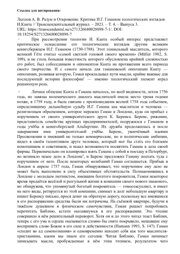 9. Hamann J.G. (2023). Brief an I. Kant, April 1774 // Johann Georg Hamann: Kommentierte Briefausgabe ( H K B ). [Электронный источник. URL: https://hamann-ausgabe.de/HKB/Briefe/406 Дата обращения: 23.10.2023].