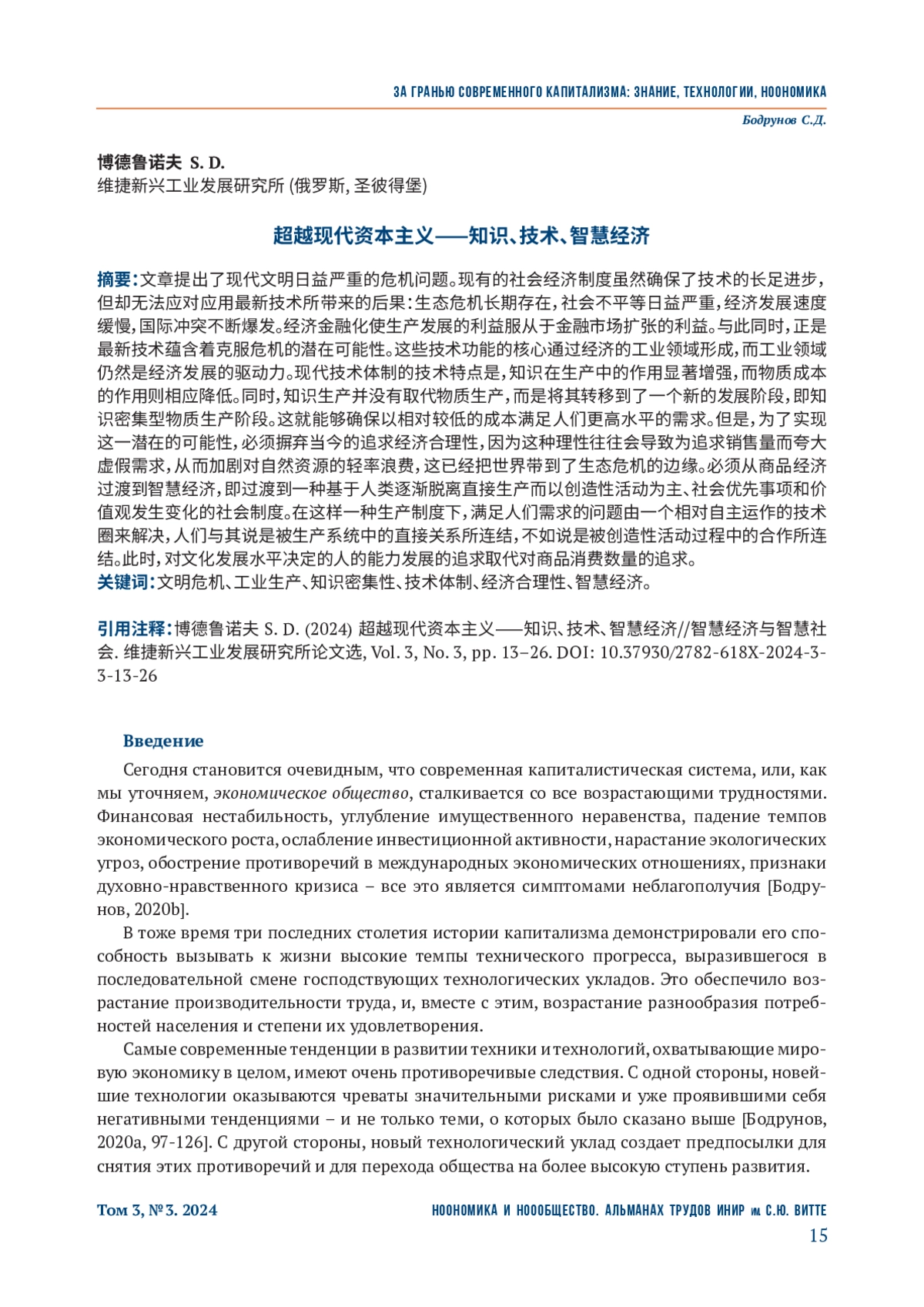 в статье поднимается вопрос о нарастании кризиса современной цивилизации. Существующая социально-экономическая система, обеспечив значительный технологический прогресс, оказалась не в состоянии справиться с последствиями применения новейших технологий. Длительное время нарастает экологический кризис, обостряется проблема социального неравенства, замедляются темпы экономического развития, разгораются международные конфликты. Финансиализация экономики подчиняет интересы развития производства интересам экспансии финансового рынка. В тоже время именно новейшие технологии содержат в себе потенциальную возможность преодоления кризисных явлений. Ядро этих технологических возможностей формируется индустриальным сектором экономики, который остается драйвером экономического развития. Технологии современных технологических укладов характеризуются значительным возрастанием роли знаний в производстве при соответствующем снижении роли материальных затрат. При этом производство знаний не встает на место материального производства, а переводит его на новую ступень развития – на ступень знаниеинтенсивного материального производства. Это позволяет обеспечить значительно более высокий уровень удовлетворения потребностей людей с относительно меньшими издержками. Но чтобы реализовать эту потенциальную возможность, необходимо уйти от сегодняшней экономической рациональности, зачастую ведущей к раздуванию симулятивных потребностей в погоне за объемами сбыта, и тем самым – к усугублению бездумной растраты природных ресурсов, что уже привело мир на грань экологического кризиса. Необходим переход от экономики к ноономике – к общественной системе, основанной на постепенном вытеснении человека из непосредственного производства, переходу людей к преимущественно творческой деятельности и изменении социальных приоритетов и ценностей. В такой производственной системе вопросы обеспечения потребности людей решает относительно автономно функционирующая техносфера, а людей связывают уже не столько отношения в системе непосредственного производства, сколько взаимодействие в процессе творческой деятельности. Критерии прежней, экономической рациональности производственного и потребительского поведения людей, сменяются критериями знания и культуры. На место погони за объемом потребляемых благ встает обеспечение развития способностей людей, определяемое уровнем их культурного развития.