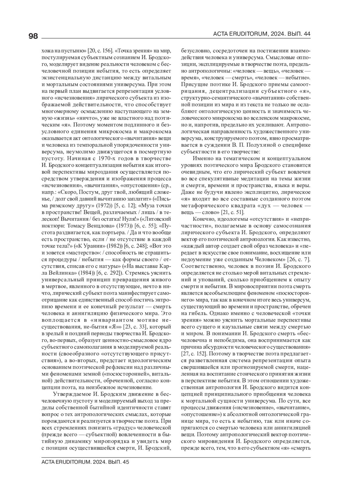 27. Спиваковский П. Е. Образы пост-смерти в поэзии Иосифа Бродского и Ольги Седаковой // Вестник РГГУ. Сер. Литературоведение. Языкознание. Культурология. 2021. № 7. С. 141-165. EDN: PMLPCP
