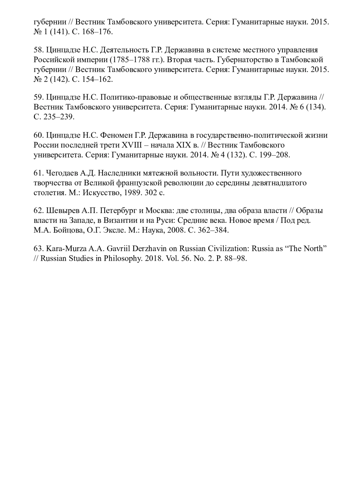 60. Цинцадзе Н.С. Феномен Г.Р. Державина в государственно-политической жизни России последней трети XVIII - начала XIX в. // Вестник Тамбовского университета. Серия: Гуманитарные науки. 2014. № 4 (132). С. 199-208. EDN: TIJTAJ