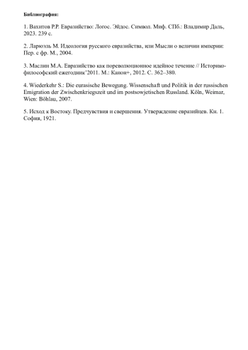 1. Вахитов Р.Р. Евразийство: Логос. Эйдос. Символ. Миф. СПб.: Владимир Даль, 2023. 239 с. EDN: EFSKAA