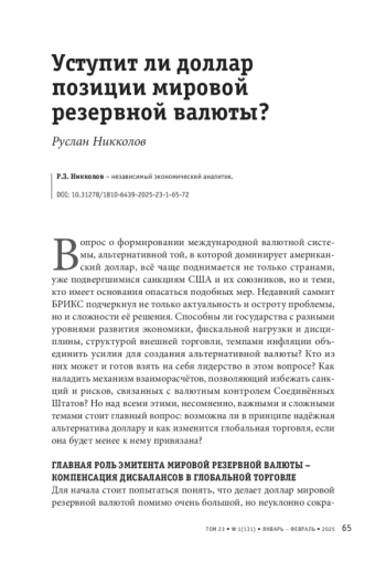 Вопрос о формировании международной валютной системы, альтернативной той, в которой доминирует американский доллар, всё чаще поднимается не только странами, уже подвергшимися санкциям США и их союзников, но и теми, кто имеет основания опасаться подобных мер. Недавний саммит БРИКС подчеркнул не только актуальность и остроту проблемы, но и сложности её решения. Способны ли государства с разными уровнями развития экономики, фискальной нагрузки и дисциплины, структурой внешней торговли, темпами инфляции объединить усилия для создания альтернативной валюты? Кто из них может и готов взять на себя лидерство в этом вопросе? Как наладить механизм взаиморасчётов, позволяющий избежать санкций и рисков, связанных с валютным контролем Соединённых Штатов? Но над всеми этими, несомненно, важными и сложными темами стоит главный вопрос: возможна ли в принципе надёжная альтернатива доллару и как изменится глобальная торговля, если она будет менее к нему привязана?
