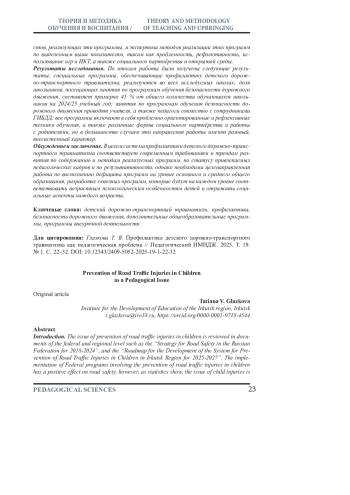 Обсуждение и заключение. В целом система профилактики детского дорожно-транспортного травматизма соответствует современным требованиям и трендам развития по содержанию и методам реализуемых программ, по статусу привлекаемых педагогических кадров и по результативности, однако необходима целенаправленная работа по восполнению дефицита программ на уровне основного и среднего общего образования, разработке сквозных программ, которые будут на каждом уровне соответствовать возрастным психологическим особенностям детей и отражать социальные аспекты каждого возраста.