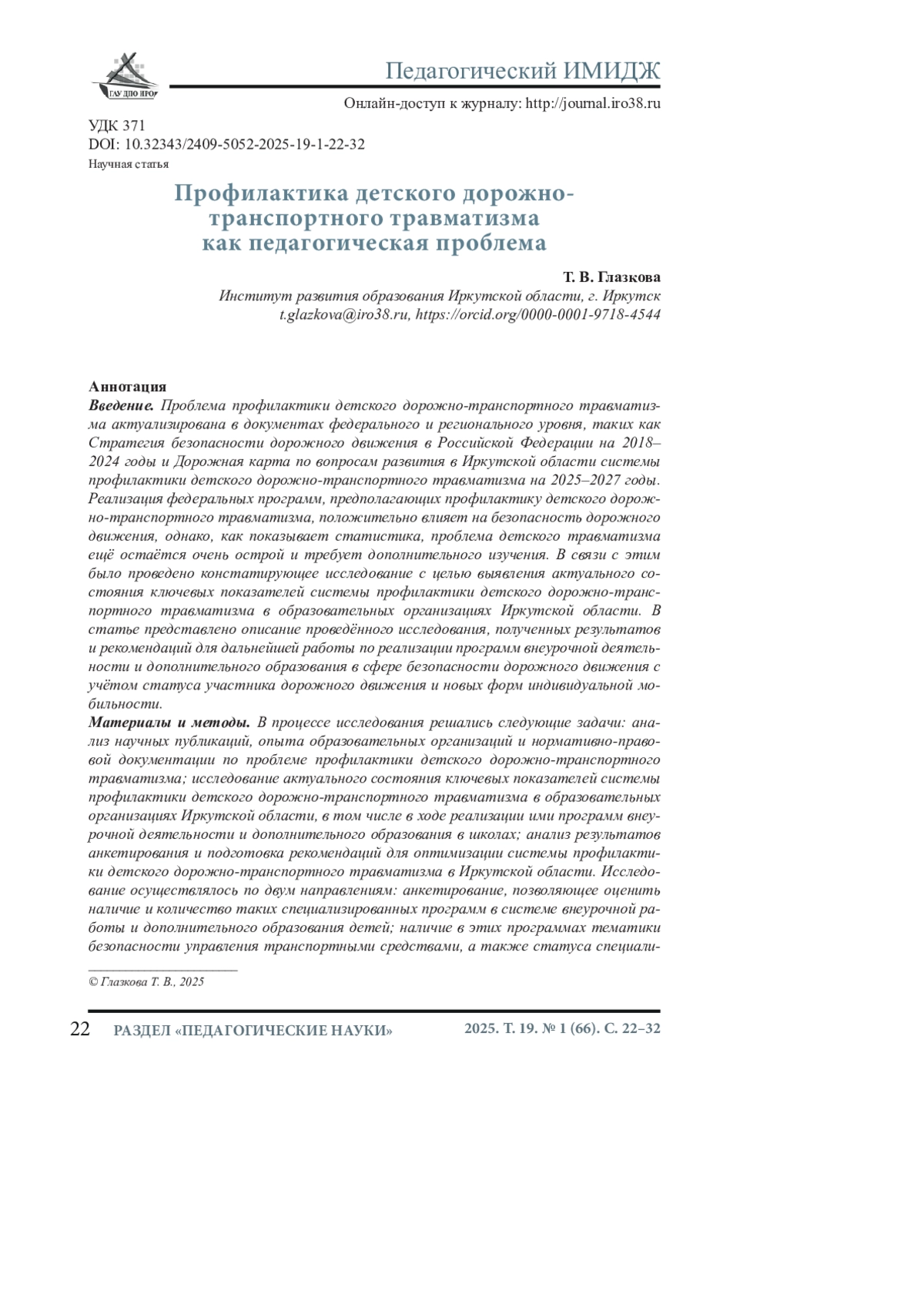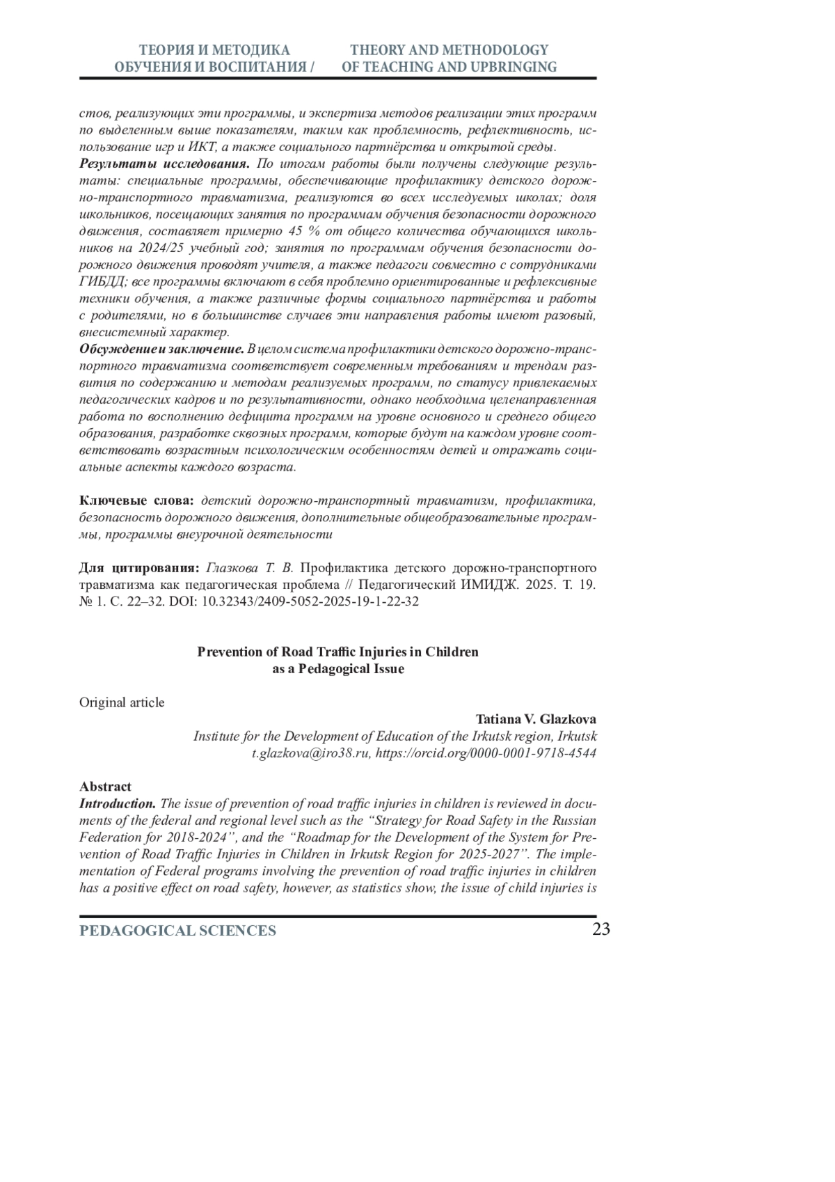 Проблема профилактики детского дорожно-транспортного травматизма актуализирована в документах федерального и регионального уровня, таких как Стратегия безопасности дорожного движения в Российской Федерации на 2018– 2024 годы и Дорожная карта по вопросам развития в Иркутской области системы профилактики детского дорожно-транспортного травматизма на 2025–2027 годы. Реализация федеральных программ, предполагающих профилактику детского дорожно-транспортного травматизма, положительно влияет на безопасность дорожного движения, однако, как показывает статистика, проблема детского травматизма ещё остаётся очень острой и требует дополнительного изучения. В связи с этим было проведено констатирующее исследование с целью выявления актуального состояния ключевых показателей системы профилактики детского дорожно-транспортного травматизма в образовательных организациях Иркутской области. В статье представлено описание проведённого исследования, полученных результатов и рекомендаций для дальнейшей работы по реализации программ внеурочной деятельности и дополнительного образования в сфере безопасности дорожного движения с учётом статуса участника дорожного движения и новых форм индивидуальной мобильности.