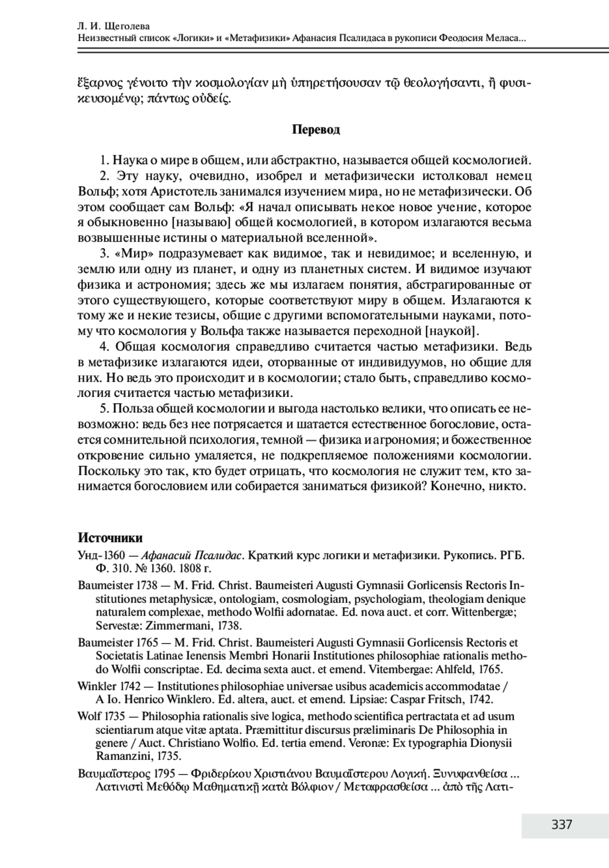 В статье вперые вводится в научный оборот неизвестный список учебного курса по логике и метафизике выдающего деятеля греческого Просвещения, писателя и педагога Афанасия Псалидаса. Этот курс был составлен Афанасием Псалидасом в 1804 г. в Янине и сохранился в автографе и нескольких поздних недатированных списках. В нем конспективно изложены философские взгляды немецкого ученого-энциклопедиста Христиана фон Вольфа, с которыми автор познакомился во время обучения в Венском университете в 1787–1795 гг. В Российской государственной библиотеке под шифром Ф. 310 (собрание В. М. Ундольского), No 1360 находится самый ранний точно датированный список данного сочинения. В статье приводятся краткие кодикологические сведения о рукописи РГБ, описываются ее состав и содержание. Список содержит трактат по логике и первые три части метафизики: онтологию, космологию и психологию (без окончания). Окончание трактата по психологии и заключительная часть метафизики — естественное богословие — отсутствуют, хотя в конце нет лакуны или обрыва текста. Приводятся сведения о писце и владельце рукописи РГБ Феодосии Меласе, представителе богатой и образованной купеческой семьи Меласов из Янины, проживавшем в России. На основании изучения водяных знаков (бумага венецианского производства) делается вывод, что рукопись была написана Феодосием Меласом еще до его переезда в Россию, скорее всего в Янине. Устанавливается, что в 1816–1819 гг. Феодосий Мелас жил в Москве, где приобрел ряд печатных изданий образовательного характера на греческом языке. Приводятся сведения об этих изданиях, а также о второй рукописи, принадлежавшей Феодосию Меласу, приобретенной В. М. Ундольским в 1863 г. и также хранящейся в РГБ. Текст новооткрытого списка сравнивается с латинскими переводами трактатов Христиана фон Вольфа по логике и метафизике, а также с их популярными учебными переложениями, составленными Иоганном Генрихом Винклером и Фридрихом Христианом Баумейстером. Устанавливается, что непосредственным источником сочинения Афанасия Псалидаса послужили неоднократно переиздававшиеся в XVIII в. учебные пособия по логике и метафизике Фридриха Христиана Баумейстера.