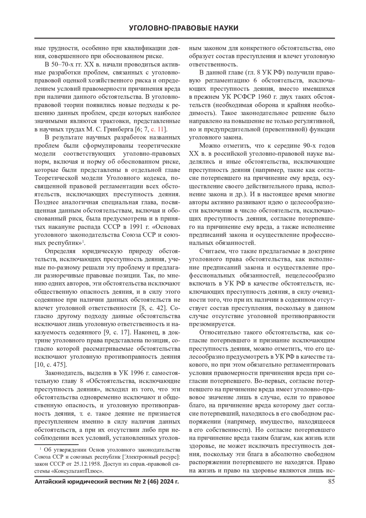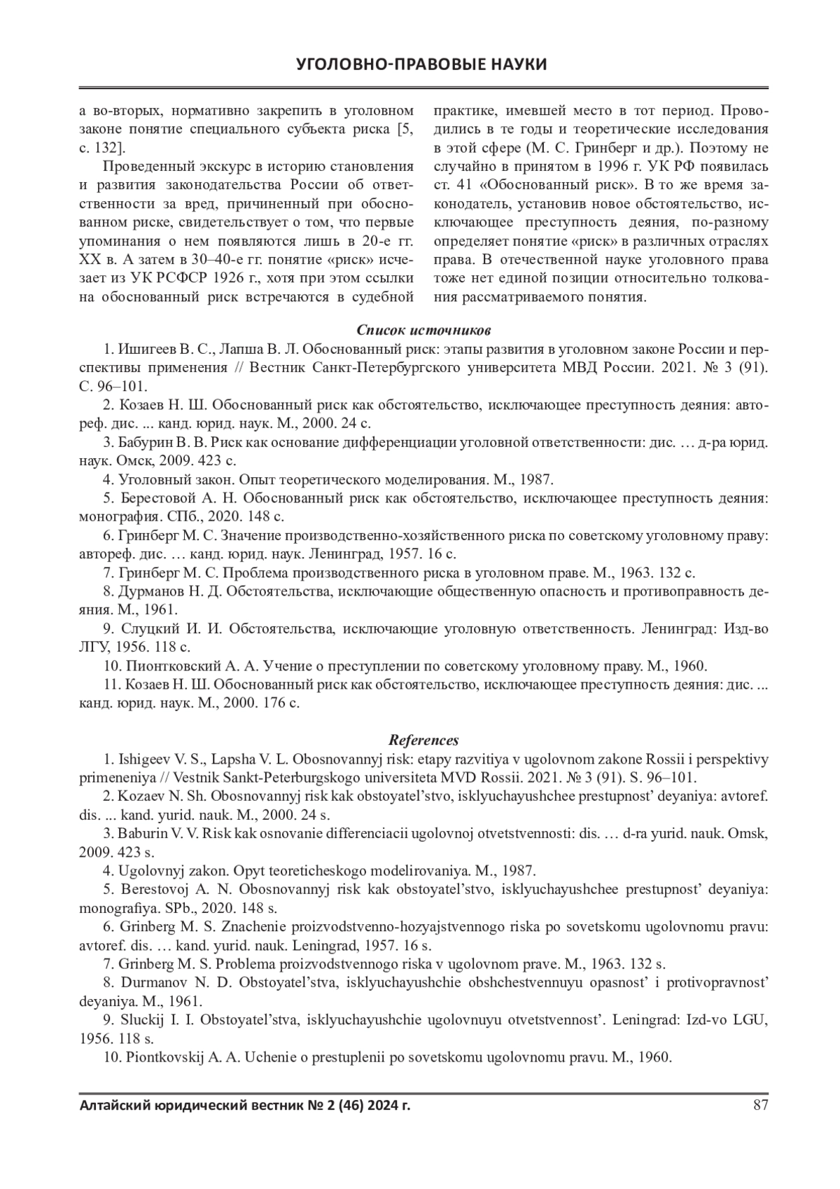 1. Ишигеев В. С., Лапша В. Л. Обоснованный риск: этапы развития в уголовном законе России и перспективы применения // Вестник Санкт-Петербургского университета МВД России. 2021. № 3 (91). С. 96-101. EDN: VXHDGH